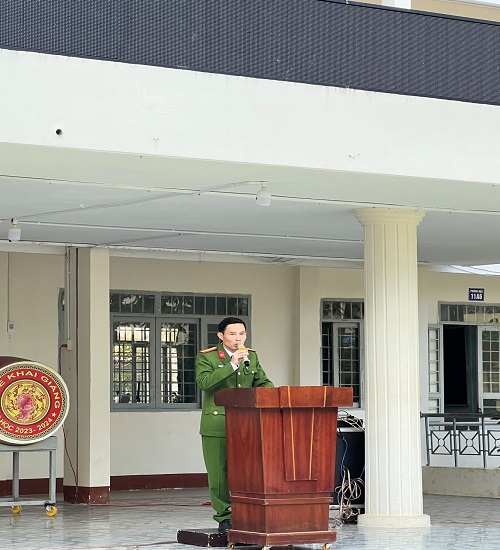 Đồng chí Trưởng Công an phường nhắc nhở các em không tham gia vào hành vi bạo lực học đường, không cổ súy, cố vũ, hay bỏ mặc các bạn bị bạo lực học đường. Qua đó, giúp các em học sinh nâng cao hiểu biết và ý thức chấp hành pháp luật, rèn luyện đạo đức, trau dồi kỹ năng sống, tự giác thực hiện tốt trách nhiệm của bản thân tránh xa các tệ nạn xã hội, các hành vi lệch chuẩn ở lứa tuổi vị thành niên, tự bảo vệ bản thân khỏi các tệ nạn xã hội, hành vi bạo lực, xâm hại.. Ngoài ra, tuyên truyền các em cần nâng cao ý thức chấp hành Luật Giao thông đường bộ, chung tay xây dựng cổng trường an toàn giao thông theo mô hình “Cổng trường an toàn” giữa Công an phường và nhà trường đã phối hợp xây dựng.