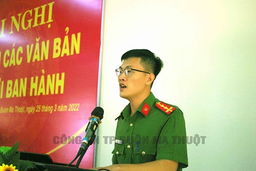 Đồng chí Đại uý, Thạc sĩ Nguyễn Diên Đức – Giảng viên khoa Cảnh sát giao thông trường Cao đẳng CSND II báo cáo viên tại Hội nghị