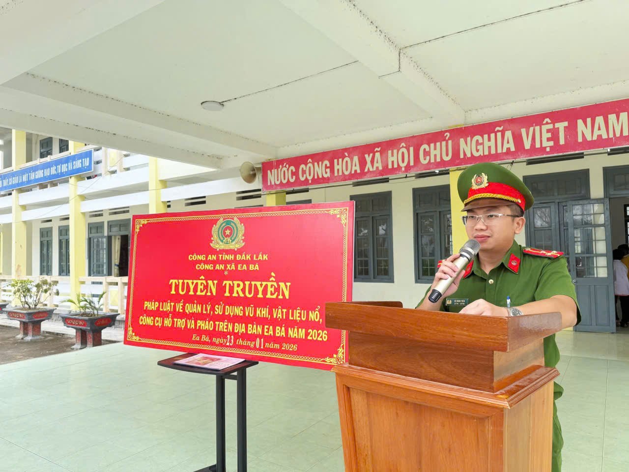 Ngày 23/01/2026, Công an xã Ea Bá tổ chức tuyên truyền pháp luật về quản lý, sử dụng vũ khí, vật liệu nổ, công cụ hỗ trợ và pháo cho học sinh Trường Tiểu học và Trung học cơ sở Ea Bá. Tại buổi tuyên truyền, cán bộ Công an xã phổ biến các quy định của pháp luật; phân tích tác hại, hậu quả nghiêm trọng của việc tàng trữ, sử dụng trái phép pháo nổ, súng tự chế; đồng thời hướng dẫn học sinh nhận diện một số loại vật liệu nổ nguy hiểm thường gặp để chủ động phòng tránh và kịp thời báo cho cơ quan chức năng.