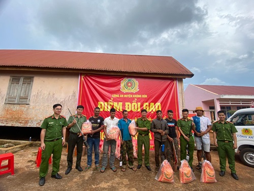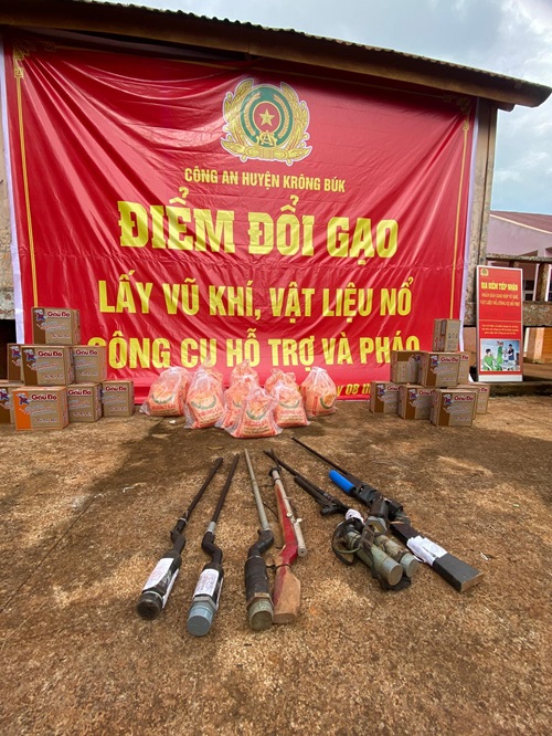 Mô hình "Điểm đổi vũ khí lấy gạo" là một trong những cách làm sáng tạo và mang lại hiệu quả tích cực trong công tác vận động người dân giao nộp vũ khí. Với mô hình này người dân có thể mang vũ khí của mình đến để đổi lấy gạo và các nhu yếu phẩm hằng ngày khác. Mục tiêu của mô hình không chỉ là thu hồi vũ khí và giảm thiểu nguy cơ bất ổn về an ninh, trật tự trong cộng đồng mà còn có tác dụng giáo dục và nâng cao ý thức của người dân đối với việc phòng ngừa các mối nguy hiểm từ vũ khí, vật liệu nổ, công cụ hỗ trợ. Mô hình đã được cấp ủy, chính quyền, người dân đánh giá cao và tích cực hưởng ứng.