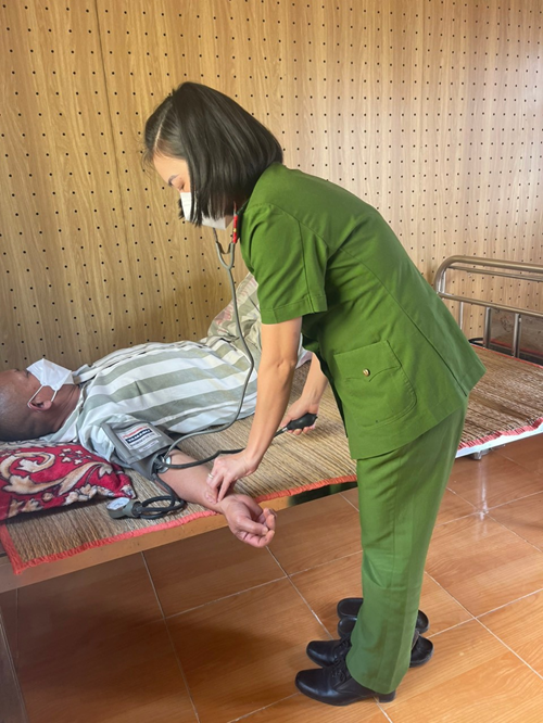 Đồng chí Thượng úy Lê Thị Thanh Nhàn cán bộ y tế Nhà tạm giữ đang kiểm tra huyết áp cho phạm nhân B.K.B hiện đang chấp hành án tại Nhà tạm giữ