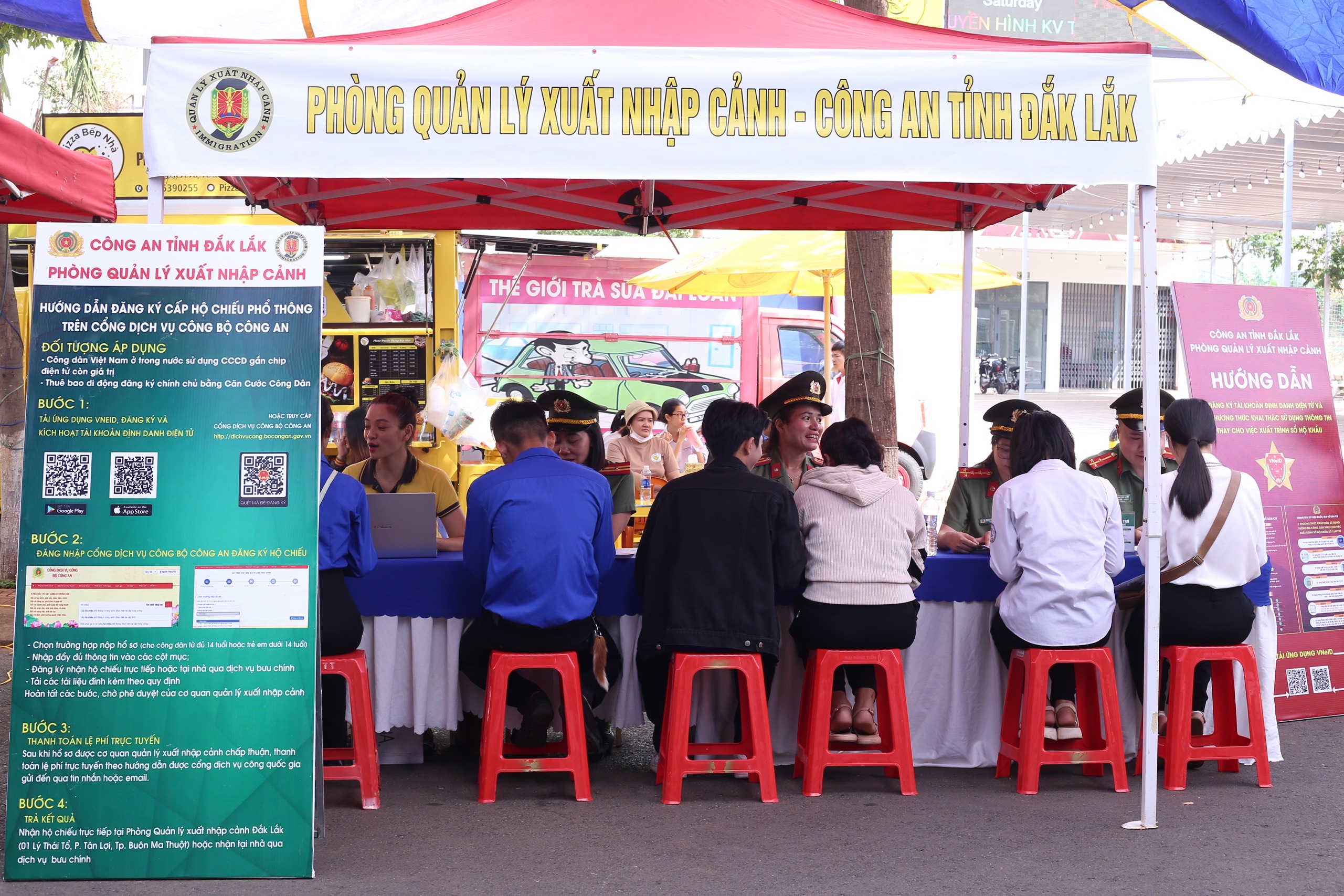 Phòng Quản lý xuất nhập cảnh tổ chức tuyên truyền pháp luật và hướng hỗ trợ cho người lao tại Ngày hội việc làm năm 2024 do Trung tâm dịch vụ việc làm Đắk Lắk (thuộc Sở Lao động - Thương binh và Xã hội) phối hợp với UBND Tp. Buôn Ma Thuột tổ chức.