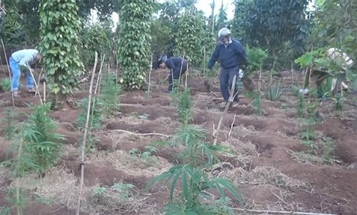Lực lượng chức năng tiến hành nhổ cây cần sa trái trồng trái phép trong rẫy cà phê