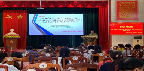 Chuyên đề 2: “Nội dung công tác bảo vệ bí mật nhà nước”, do đồng chí Thượng tá Trương Thế Sơn - Phó Trưởng phòng An ninh chính trị trình bày. Nội dung chuyên đề tập trung đi sâu vào hướng dẫn thực hiện một số nội dung được quy định tại Luật Bảo vệ bí mật nhà nước; Nghị định số 26/2020/NĐ-CP, ngày 28/02/2020 của Chính phủ quy định chi tiết một số điều của Luật Bảo vệ bí mật nhà nước; Thông tư số 24/2020/TT-BCA, ngày 10/3/2020 của Bộ trưởng Bộ Công an ban hành biểu mẫu sử dụng trong công tác bảo bí mật nhà nước. Theo đó, đồng chí nhấn mạnh các nguyên tắc, hành vi nghiêm cấm trong công tác bảo vệ bí mật nhà nước; vai trò trách nhiệm của các tổ chức, cá nhân trong việc thực hiện công tác bảo vệ bí mật nhà nước và thẩm quyền và quy trình: xác định bí mật nhà nước, độ mật bí mật nhà nước, sao, chụp, chuyển giao, lưu trữ; tổ chức hội nghị hội thảo có yếu tố bí mật nhà nước; mang tài liệu, vật chứa bí mật nhà nước ra khỏi cơ quan; chuyển giao bí mật nhà nước…