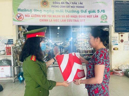 Tiếp chuỗi hoạt động, ngày 02/6/2023, Phòng Cảnh sát môi trường phối hợp với Ban quản lý chợ Buôn Ma Thuột tuyên truyền pháp luật về môi trường và phát 1000 túi giấy tự hủy, 1000 túi vải sử dụng nhiều lần cho người dân, tiểu thương tại chợ.