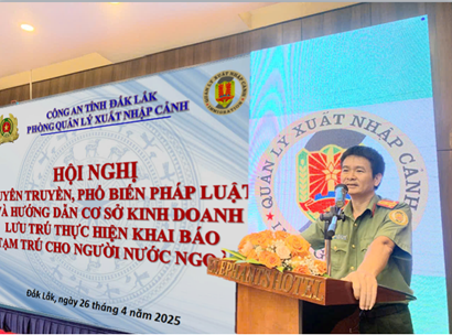 Ngày 26/4/2025, Công an tỉnh tổ chức Hội nghị tuyên truyền, phổ biến pháp luật và hướng dẫn cơ sở kinh doanh lưu trú thực hiện khai báo tạm trú cho người nước ngoài do Thượng tá Nguyễn Mỹ Thành - Phó trưởng Phòng Quản lý xuất nhập cảnh chủ trì Hội nghị. Tham dự Hội nghị có các đồng chí chỉ huy, cán bộ chiến sĩ Phòng Quản lý xuất nhập cảnh và đại diện 74 cơ sở kinh doanh lưu trú (khách sạn, nhà nghỉ, homestay…) trên địa bàn thành phố Buôn Ma Thuột.