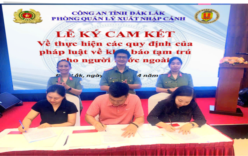 Nhằm nâng cao ý thức chấp hành pháp luật của các chủ cơ sở kinh doanh lưu trú trong việc khai báo tạm trú cho người nước ngoài, đảm bảo an ninh trật tự và quản lý cư trú theo quy định của pháp luật Việt Nam, Phòng Quản lý xuất nhập cảnh Công an tỉnh và đại diện các cơ sở kinh doanh lưu đã tiến hành ký cam kết về thực hiện các quy định của pháp luật về khai báo tạm trú cho người nước ngoài. Việc tổ chức lễ ký cam kết này giúp các cơ sở kinh doanh lưu trú nắm kỹ các quy định của pháp luật và thấy rõ quyền lợi, nghĩa vụ và trách nhiệm của mình trong công tác khai báo tạm trú của người nước ngoài để thực hiện nghiêm túc.