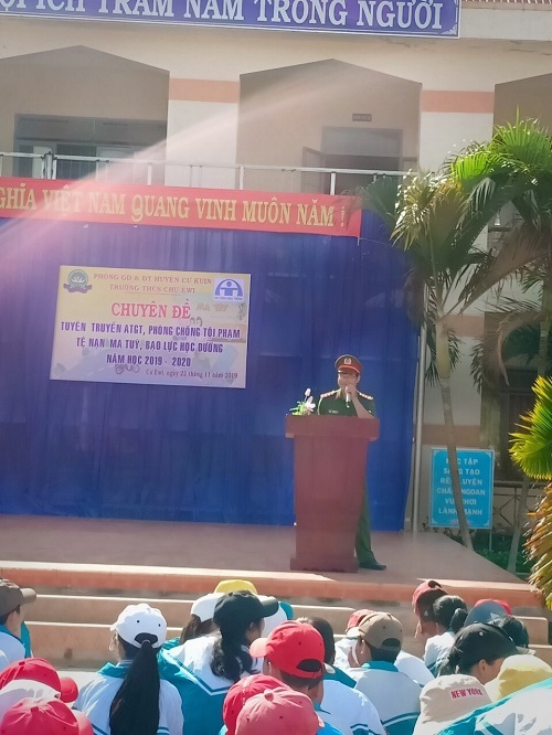 Ngày 22/11/2019, Công an huyện Cư Kuin phối hợp với Phòng Giáo dục và Đào tạo huyện Cư Kuin tổ chức chương trình tuyên truyền pháp luật về an toàn giao thông; phòng, chống tội phạm tệ nạn ma tuý, bạo lực học đường năm học 2019 - 2020 tại trường THCS Cư Êwi, huyện Cư Kuin.