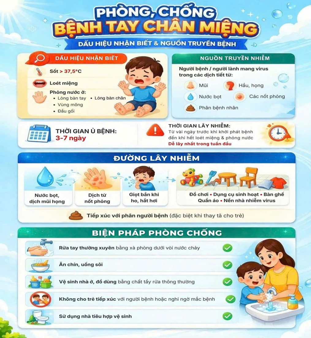 Tay chân miệng là bệnh truyền nhiễm cấp tính do vi rút Enterovirus gây ra, lây chủ yếu qua đường tiêu hóa khi tiếp xúc với nước bọt, dịch tiết từ các nốt phỏng hoặc qua các vật dụng sinh hoạt bị nhiễm mầm bệnh. Bệnh dễ lây lan trong môi trường tập thể như nhà trẻ, trường mẫu giáo và khu dân cư đông đúc. Các triệu chứng ban đầu thường là sốt nhẹ, đau họng, mệt mỏi, sau đó xuất hiện các nốt phỏng nước ở lòng bàn tay, bàn chân, trong miệng hoặc vùng mông. Trong một số trường hợp, bệnh có thể diễn biến nhanh, gây biến chứng nguy hiểm như viêm não, viêm màng não, viêm cơ tim, thậm chí dẫn đến tử vong nếu không được phát hiện và điều trị kịp thời.