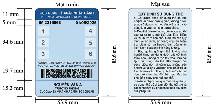 Trong việc ứng dụng công nghệ sinh trắc học vào hệ thống thẻ và giấy phép kiểm soát an ninh hàng không, mẫu thẻ kiểm soát an ninh cảng hàng không, sân bay dài hạn đã được nâng cấp đáng kể. Để tăng cường khả năng nhận diện và chống làm giả, thẻ dài hạn cấp cho cá nhân và phương tiện hiện được tích hợp mã BE Code chứa dữ liệu khuôn mặt đã được mã hóa cùng chữ ký số. Tại các điểm kiểm tra an ninh, hệ thống thiết bị chuyên dụng sẽ thực hiện so khớp sinh trắc học trực tiếp từ mã BE Code trên thẻ với người sử dụng thực tế, qua đó loại bỏ hoàn toàn nguy cơ mạo danh hoặc sử dụng thẻ giả. Phôi thẻ cũng được in chìm logo của Cục Quản lý xuất nhập cảnh nhằm bảo đảm tính xác thực và nâng cao hiệu quả công tác kiểm tra, giám sát.