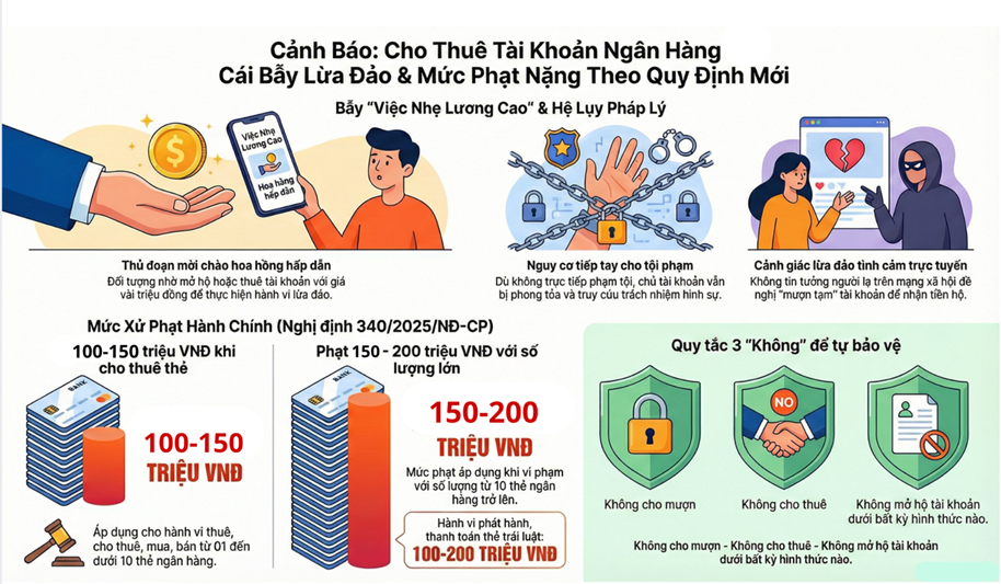 Trước thực trạng trên, cơ quan chức năng khuyến cáo người dân trên địa bàn tỉnh Đắk Lắk tuyệt đối không cho mượn, cho thuê, mua bán hoặc mở hộ tài khoản ngân hàng dưới bất kỳ hình thức nào. Cần nâng cao cảnh giác trước các lời mời chào “việc nhẹ lương cao”, nhờ nhận tiền hộ, chuyển tiền giúp hoặc đầu tư tài chính không rõ nguồn gốc. Việc giao tài khoản cá nhân cho người khác sử dụng, dù không hưởng lợi, vẫn có thể bị xử phạt hành chính hoặc truy cứu trách nhiệm hình sự.