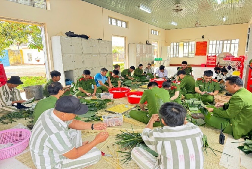 Hình ảnh cán bộ, chiến sĩ và phạm nhân gói bánh chưng chuẩn bị đón Tết Nguyên đán cổ truyền của Việt Nam