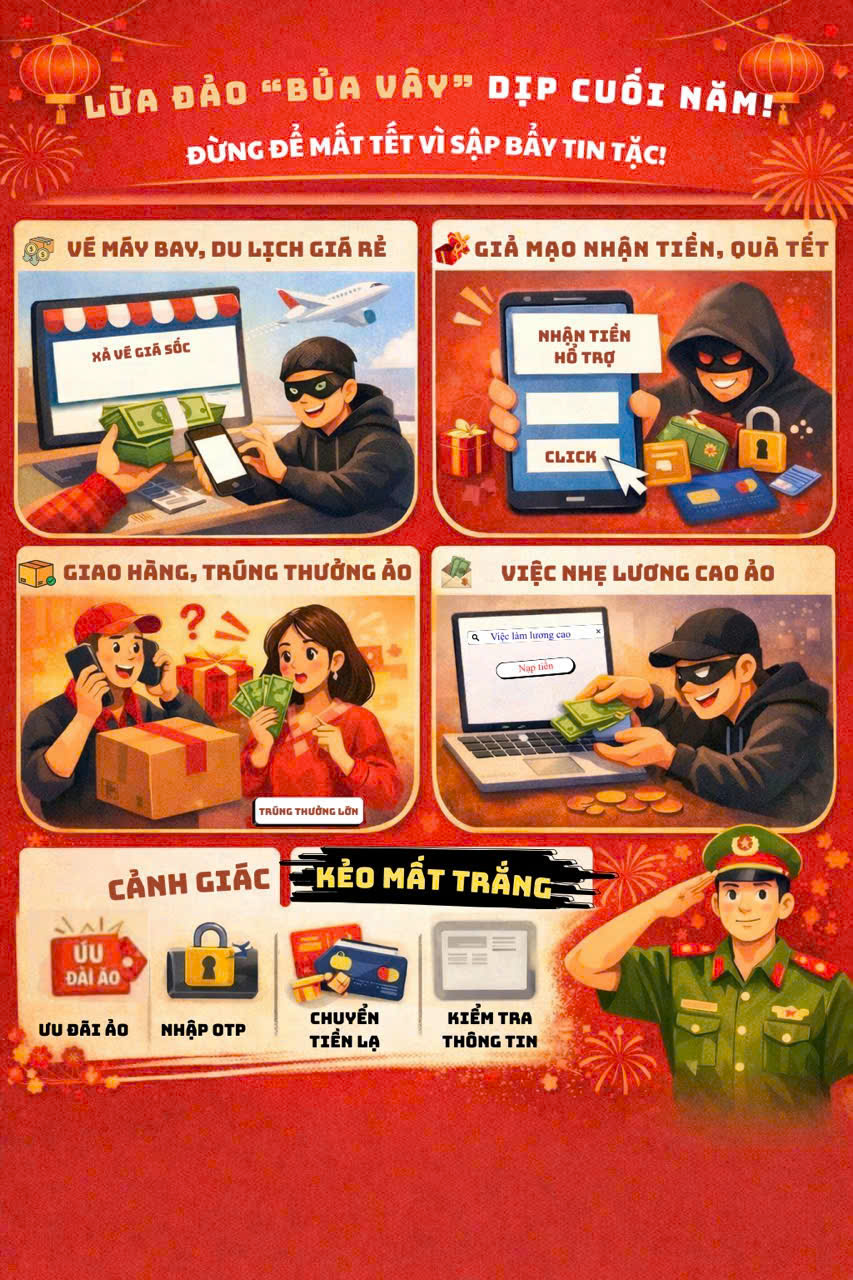 Hiện nay, các thủ đoạn lợi dụng không gian mạng để lừa đảo chiếm đoạt tài sản ngày càng đa dạng, từ vé máy bay giá rẻ, tour du lịch “siêu khuyến mãi”, cho đến những chiêu trò nhận quà, hỗ trợ tiền mặt, trúng thưởng hay việc làm thêm tại nhà… Đặc biệt, cứ vào thời điểm trước, trong và sau dịp Tết Nguyên đán hằng năm, khi mà nhu cầu mua sắm, giao dịch của người dân tăng cao, các đối tượng lại gia tăng hoạt động, liên tục tung ra nhiều kịch bản tinh vi, đánh vào tâm lý ham rẻ, nhẹ dạ và thiếu cảnh cảnh của người dân để lừa đảo chiếm đoạt tài sản.