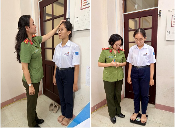 Cán bộ Công an phường kiểm tra ngoại hình tổng quát các thí sinh đăng ký dự tuyển vào các trường CAND