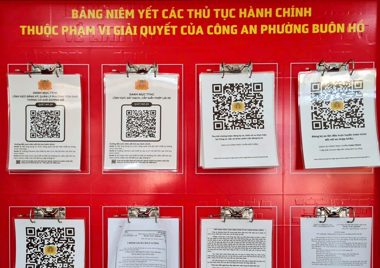 Tiếp nối những nỗ lực đó, năm 2025 đã đánh dấu những bước tiến vượt bậc của Công an phường Buôn Hồ trong việc hiện đại hóa công tác hành chính. Đơn vị đã xây dựng được một hệ sinh thái truyền thông số mạnh mẽ với trang Zalo thu hút 38.846 lượt người theo dõi và Fanpage Facebook đạt 17.854 lượt theo dõi, mang lại con số ấn tượng với hơn 4 triệu lượt xem. Đặc biệt, đơn vị đã triển khai thành công mô hình "Trợ lý ảo AI-Livestream-Fanpage chính thức (Mô hình A-L-F)" trong tuyên truyền pháp luật và hướng dẫn thủ tục hành chính trực tuyến. Mô hình này không chỉ thu hút hơn 18.000 lượt xem mà còn trực tiếp giải đáp hơn 90 thắc mắc của người dân, giúp các quy định pháp luật trở nên gần gũi và dễ hiểu hơn. Song song đó, Công an phường đã thực hiện niêm yết công khai 100% thủ tục hành chính qua cả văn bản và mã QR, đảm bảo mọi hồ sơ đều được giải quyết đúng hạn, không có tình trạng chậm, muộn phát sinh phản ánh, kiến nghị, giúp tỷ lệ hài lòng của người dân luôn đạt mức cao.