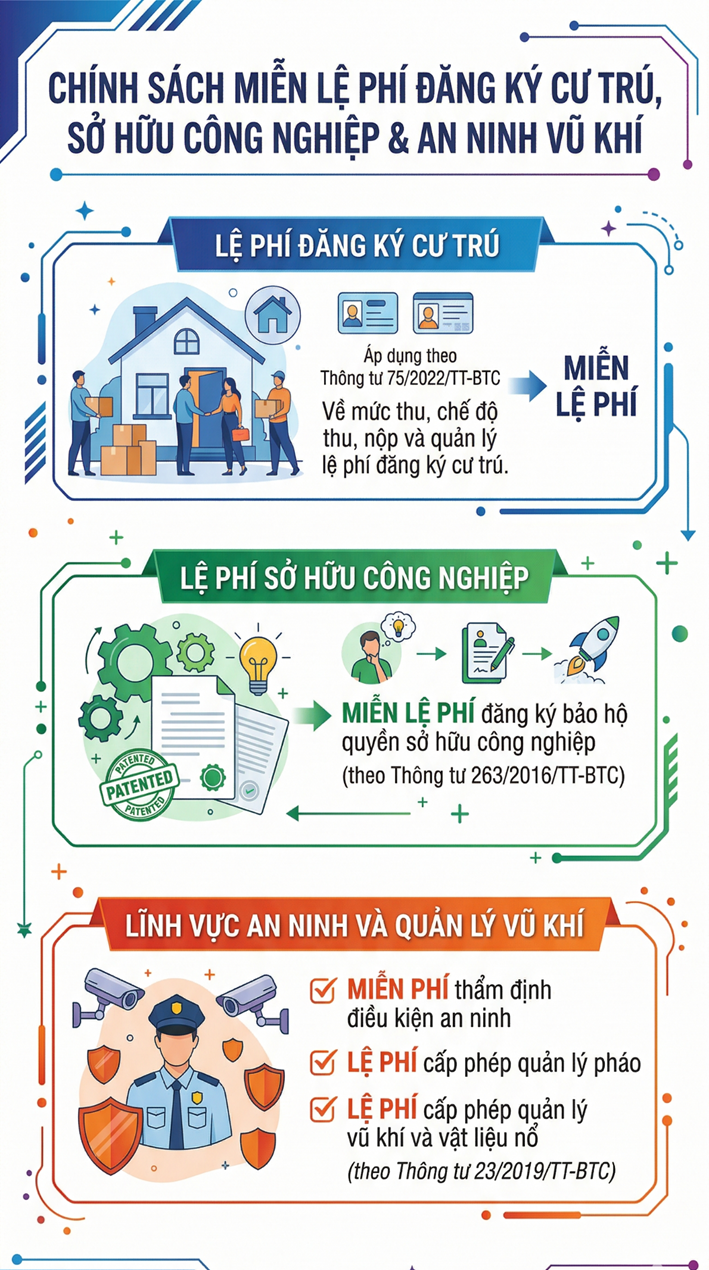 Bên cạnh chính sách miễn phí, Thông tư 29/2026/TT-BTC cũng quy định giảm 50% mức thu hiện hành đối với 6 khoản phí, lệ phí khi thực hiện qua VNeID. Đáng chú ý nhất là nhóm lệ phí liên quan trực tiếp đến đời sống hàng ngày của người dân và hoạt động của doanh nghiệp: