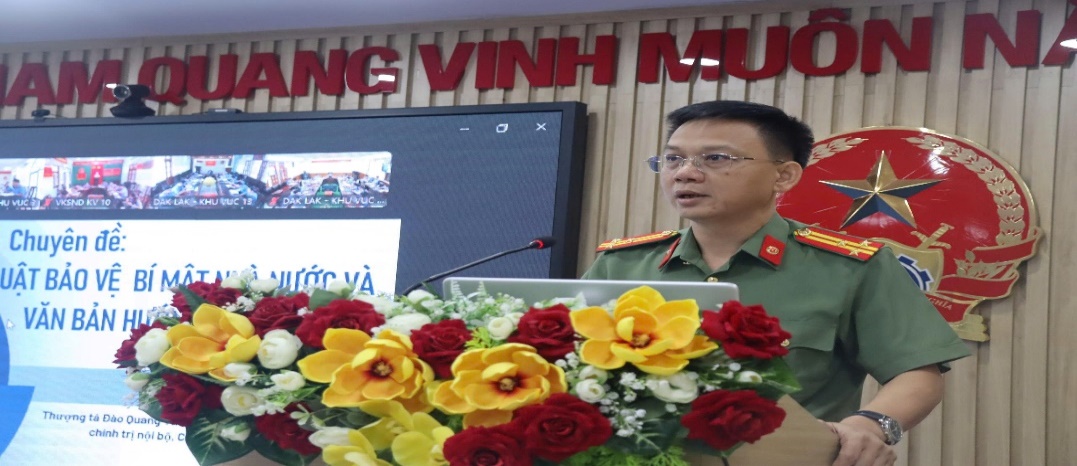 Tại Hội nghị, đồng chí Thượng tá Đào Quang Thái – Phó Trưởng phòng An ninh chính trị nội bộ đã trực tiếp truyền đạt những nội dung cơ bản của Luật Bảo vệ bí mật nhà nước năm 2025; Nghị định số 63/NĐ-CP, ngày 28/02/2026 quy định chi tiết một số điều và biện pháp thi hành Luật Bảo vệ bí mật nhà nước; Chị thị số 08-CT/TU ngày 06/02/2026 của Ban Thường vụ Tỉnh ủy về tăng cường công tác bảo vệ bí mật nhà nước trên địa bàn tỉnh Đắk Lắk trong tình hình mới. Bên cạnh đó, các đại biểu còn được hướng dẫn cụ thể về trình tự xác định bí mật nhà nước và độ mật của bí mật nhà nước; về sao, chụp tài liệu, vật chứa bí mật nhà nước; quy trình, thủ tục giải mật, điều chỉnh độ mật, gia hạn, tiêu hủy tài liệu, vật chứa bí mật nhà nước theo quy định pháp luật. Đồng thời, phân tích, làm rõ những vấn đề thực tiễn, kinh nghiệm, những nguy cơ tiềm ẩn dẫn đến lộ, mất bí mật nhà nước trong tình hình hiện nay. Hội nghị cũng dành nhiều thời gian để các đại biểu trao đổi, thảo luận và được báo cáo viên Phòng An ninh chính trị nội bộ giải đáp, hướng dẫn cụ thể.