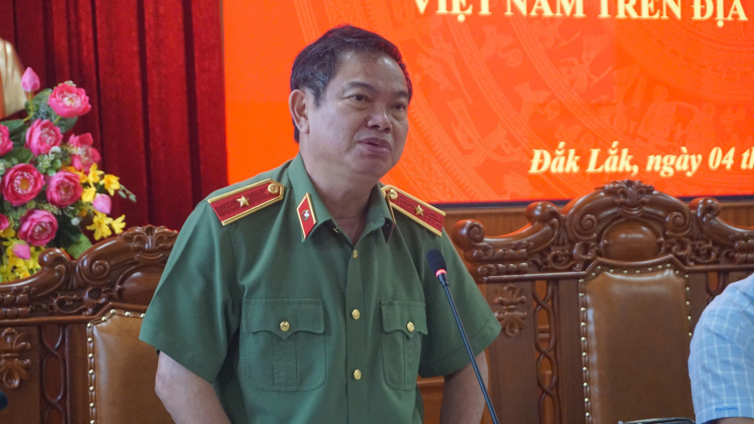 Đồng chí Thiếu tướng Phan Thanh Tám – Giám đốc Công an tỉnh phát biểu ý kiến đánh giá về tình hình ANTT liên quan các Công ty cà phê trên địa bàn tỉnh.