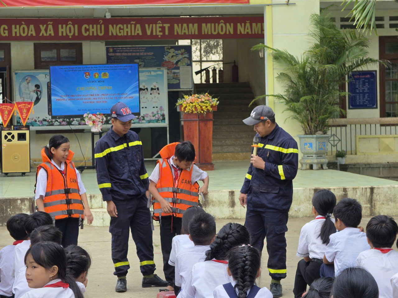 Tại buổi tuyên truyền, các em học sinh được hướng dẫn cách đội mũ bảo hiểm đúng quy cách, nhận biết các tình huống nguy hiểm khi tham gia giao thông và nâng cao ý thức chấp hành luật lệ. Bên cạnh đó, cán bộ, đoàn viên còn trực tiếp phổ biến kiến thức về phòng cháy chữa cháy, hướng dẫn kỹ năng xử lý khi xảy ra sự cố cháy nổ, cách thoát hiểm an toàn và sử dụng một số phương tiện chữa cháy cơ bản. Nội dung phòng ngừa đuối nước cũng được truyền tải sinh động, giúp các em hiểu rõ nguy cơ, biết cách tự bảo vệ bản thân khi vui chơi gần ao, hồ, sông, suối.