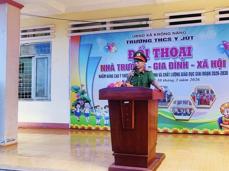Sáng ngày 30/3/2026, tại Trường THCS Y Jut, Công an xã Krông Năng tham dự chức buổi đối thoại trực tiếp kết hợp tuyên truyền, phổ biến kiến thức pháp luật về “phòng, chống bạo lực học đường” và “phòng, chống ma túy”. Sự kiện đầy ý nghĩa này có sự tham gia của hơn 1.200 lượt người tham dự, bao gồm học sinh, phụ huynh và đại diện các thôn buôn trên địa bàn. Đây không chỉ là hoạt động chuyên môn mà còn là hành động thiết thực, sự sát cánh của lực lượng Công an cùng nhà trường và cộng đồng trong việc bảo vệ thế hệ thanh thiếu niên của đất nước.