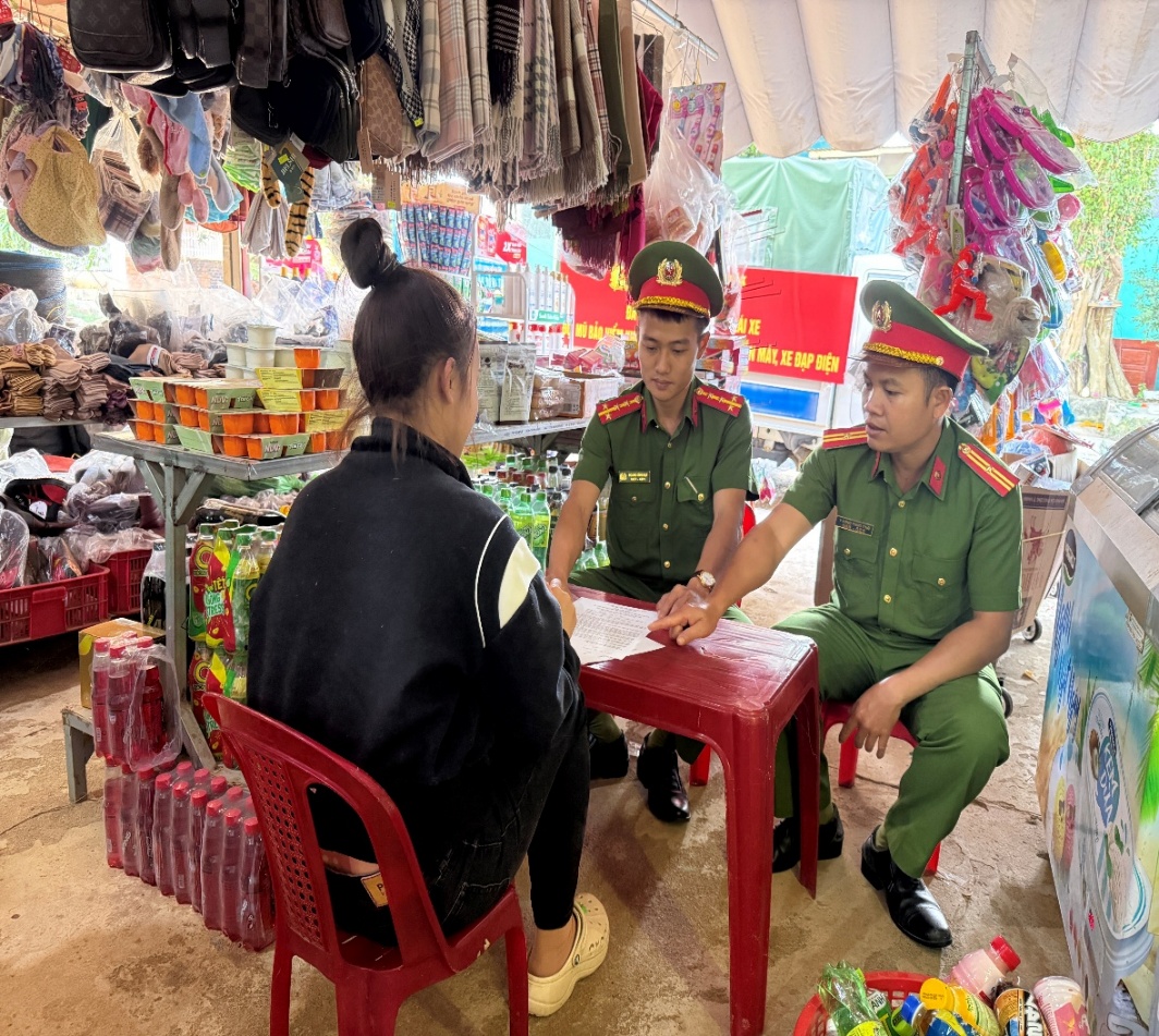 Lực lượng Công an xã tuyên truyền và ký cam kết tại các cơ sở kinh doanh