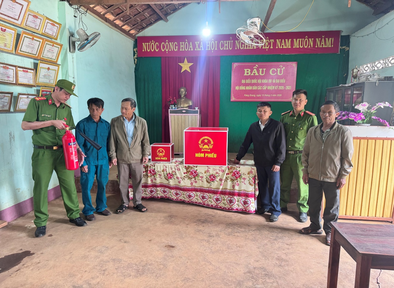 Công an xã Pơng Drang tăng cường công tác bảo đảm an toàn PCCC và CNCH tại các điểm diễn ra bầu cử trên địa bàn