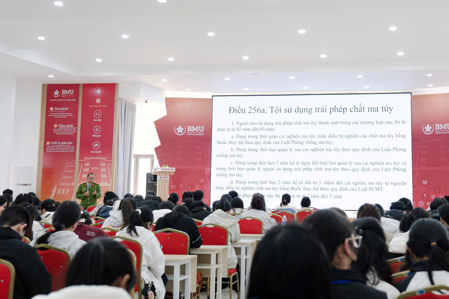 Thực hiện Dự án 7 trong Chương trình mục tiêu quốc gia phòng chống ma túy đến năm 2030, Quyết định 2984/QĐ-BGDĐT, ngày 28/10/2025 của Bộ Giáo dục và Đào tạo về việc ban hành Kế hoạch triển khai Tiểu Dự án 3 :Tăng cường công tác tuyên truyền giáo dục pháp luật về phòng, chống ma túy cho học sinh, sinh viên giai đoạn 2025 - 2030, Phòng Cảnh sát điều tra tội phạm về ma túy Công an tỉnh Đắk Lắk phối hợp với các cơ sở giáo dục tuyên truyền phòng chống ma túy cho sinh viên các trường đại học trên địa bàn tình gồm: Trường Đại học Đông Á, Trường Đại học Y Dược Buôn Ma Thuột, tập trung tuyên truyền quan điểm của Đảng, nhà nước về phòng chống và kiểm soát ma túy, tình hình tội phạm ma túy, nhận biết các chất ma túy, trách nhiệm trong công tác phòng chống ma túy đặc biệt là Điều 256a Bộ Luật Hình sự Tội “Sử dụng trái phép chất ma túy”. Qua đó trang bị, nâng cao kiến thức pháp luật và kỹ năng tự phòng, chống, bảo vệ bản thân, không sa vào tệ nạn và tội phạm ma túy, với khẩu hiệu sinh viên nói không với ma túy.