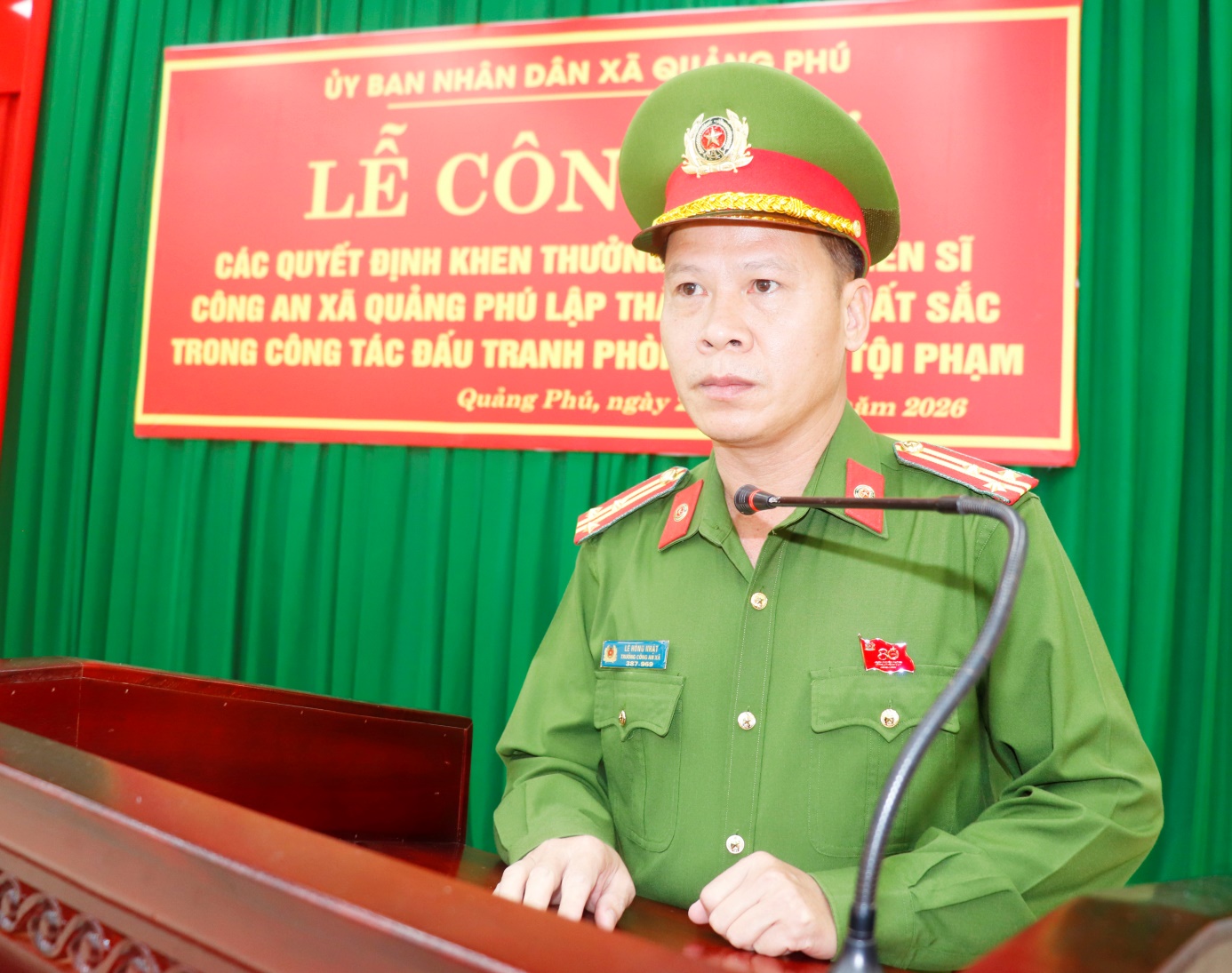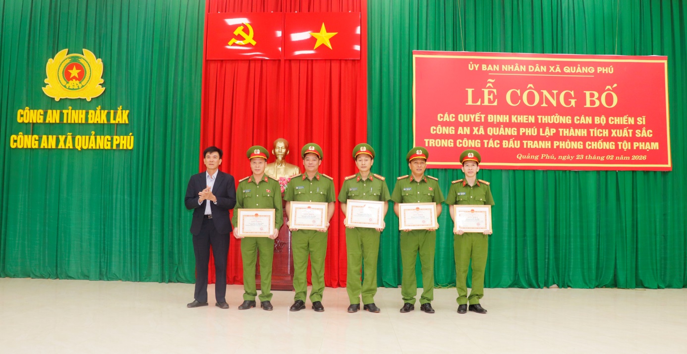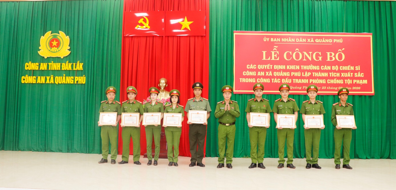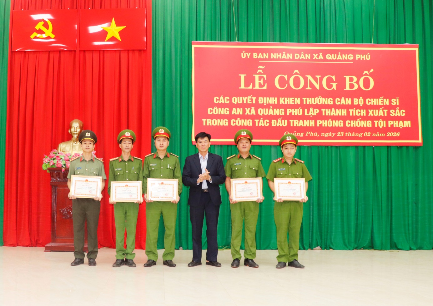 Trong khí thế thi đua sôi nổi lập thành tích bảo đảm an ninh, trật tự phục vụ các sự kiện chính trị trọng đại của đất nước, sáng ngày 23/02/2026, Ủy ban nhân dân xã Quảng Phú đã tổ chức Lễ công bố Quyết định khen thưởng 19 cá nhân thuộc Công an xã Quảng Phú có thành tích xuất sắc trong đợt cao điểm tấn công, trấn áp tội phạm.