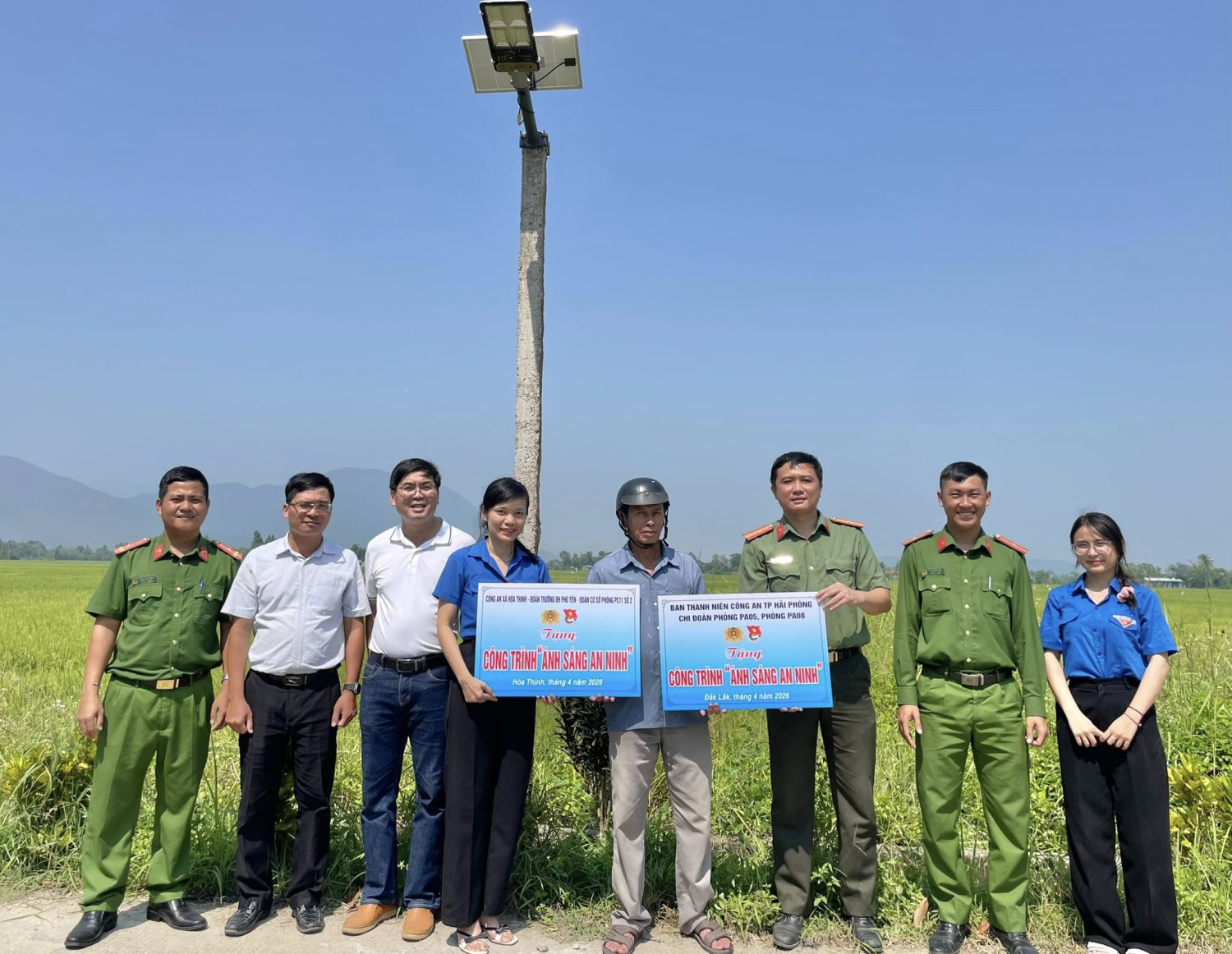 Tiếp đó, đoàn đã bàn giao công trình “Ánh sáng an ninh” tại các thôn Cảnh Tịnh và Mỹ Xuân 1 với 10 trụ đèn sử dụng năng lượng mặt trời được lắp đặt. Công trình góp phần nâng cao hiệu quả công tác đảm bảo an ninh trật tự, giảm thiểu các vụ tai nạn giao thông, đồng thời phục vụ nhu cầu sinh hoạt, đi lại của người dân vào ban đêm.