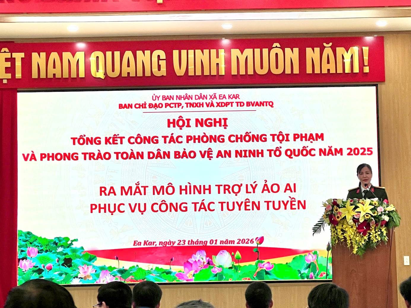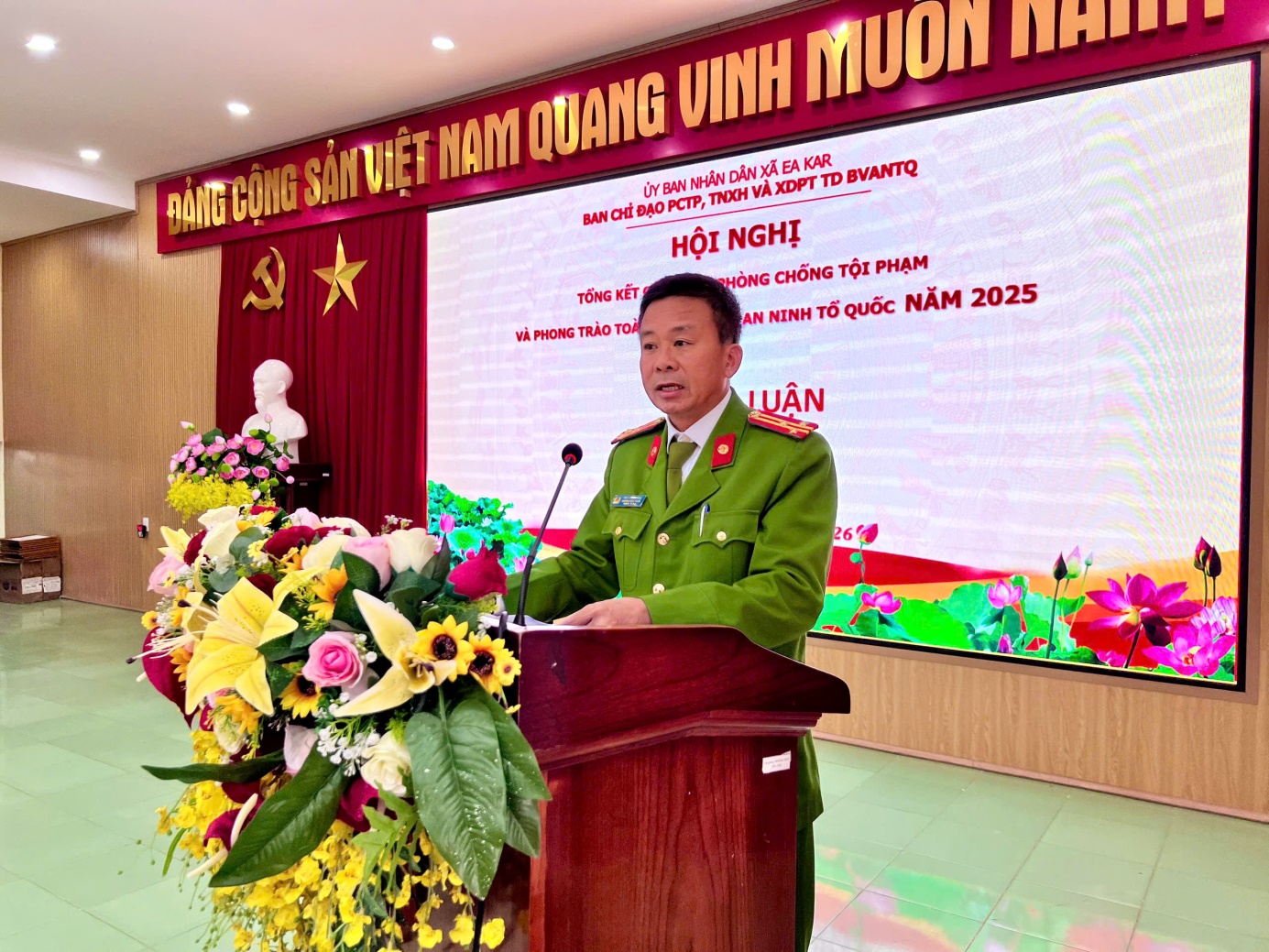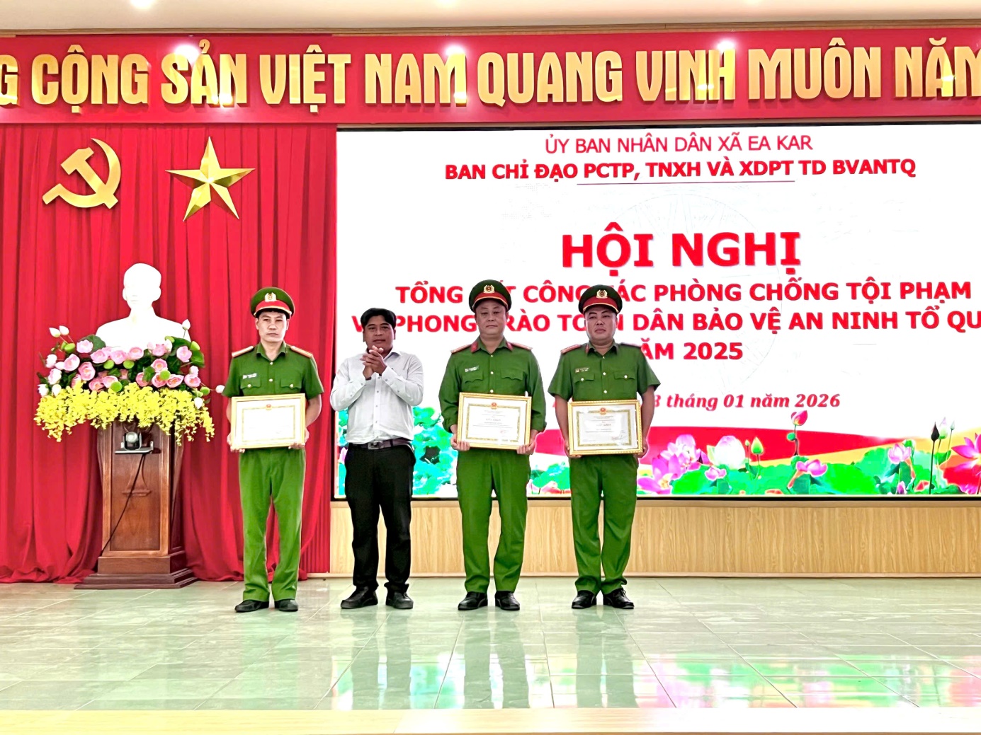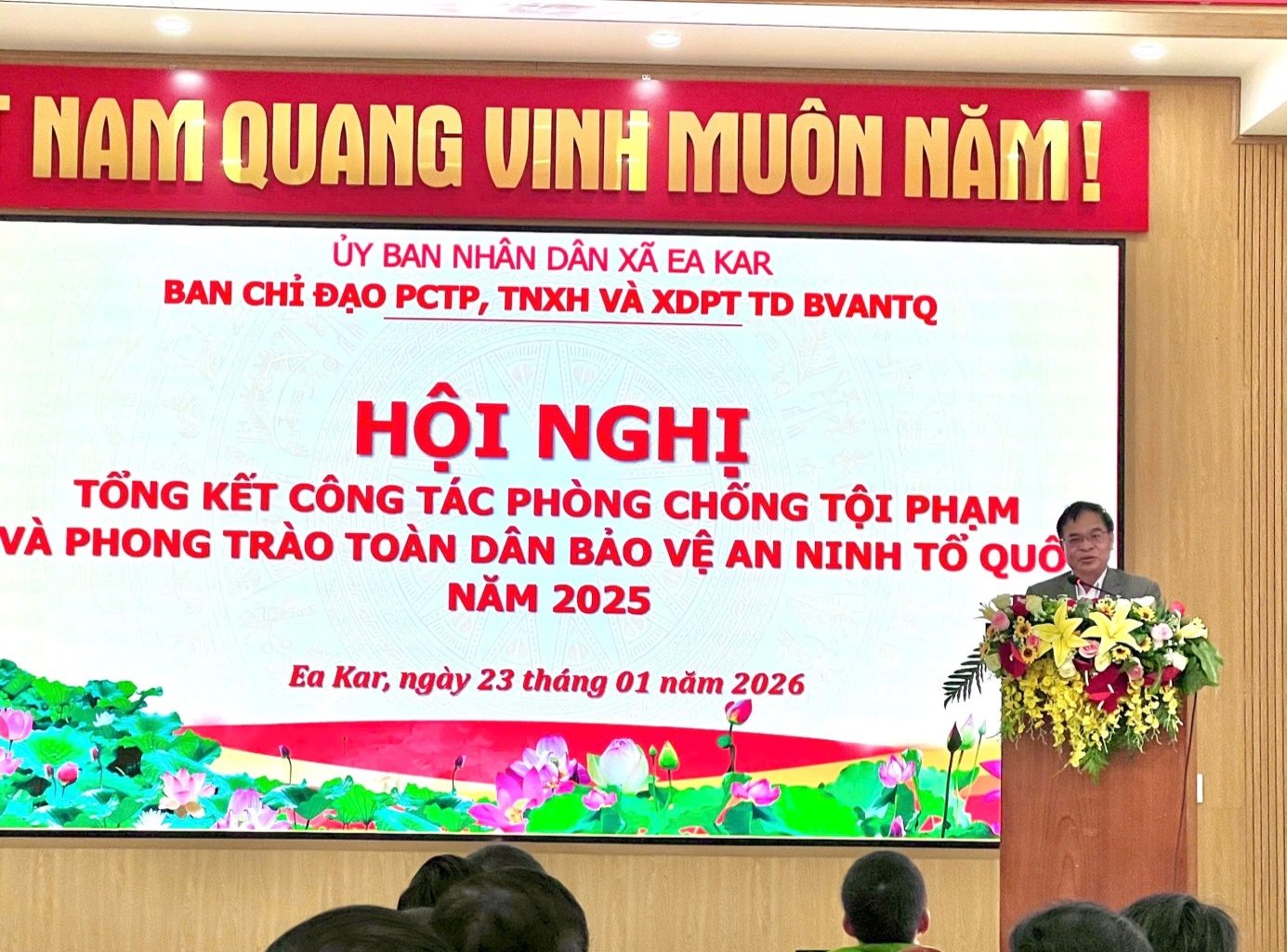 Ngày 23/01/2026, Ban Chỉ đạo phòng, chống tội phạm, tệ nạn xã hội và xây dựng phong trào Toàn dân bảo vệ an ninh Tổ quốc xã Ea Kar (sau đây gọi tắt là Ban Chỉ đạo) tổ chức Hội nghị tổng kết công tác phòng, chống tội phạm và phong trào Toàn dân bảo vệ an ninh Tổ quốc năm 2025.