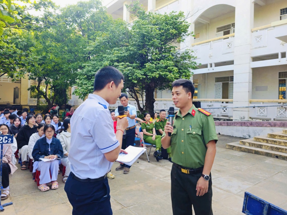 Buổi tuyên truyền tập trung phổ biến các quy định của pháp luật về trật tự an toàn giao thông như độ tuổi điều khiển phương tiện, việc đội mũ bảo hiểm đúng quy định, không chở quá số người, chấp hành tín hiệu đèn giao thông, đi đúng làn đường, phần đường và nhận diện các lỗi vi phạm thường gặp ở lứa tuổi học sinh; đồng thời tuyên truyền về phòng, chống vi phạm pháp luật trong học đường, trong đó nhấn mạnh việc nhận diện hành vi bạo lực học đường, các hành vi vi phạm phổ biến, hậu quả pháp lý có thể phải đối mặt và trang bị kỹ năng xử lý tình huống, ứng xử văn minh, tự bảo vệ bản thân trong các tình huống phát sinh; bên cạnh đó, chương trình còn lồng ghép nội dung tư vấn tuyển sinh vào các trường Công an nhân dân năm 2026 với các thông tin về tiêu chuẩn chính trị, phẩm chất đạo đức, sức khỏe, điều kiện dự tuyển, phương thức, quy trình đăng ký và định hướng lựa chọn phù hợp với năng lực của học sinh.