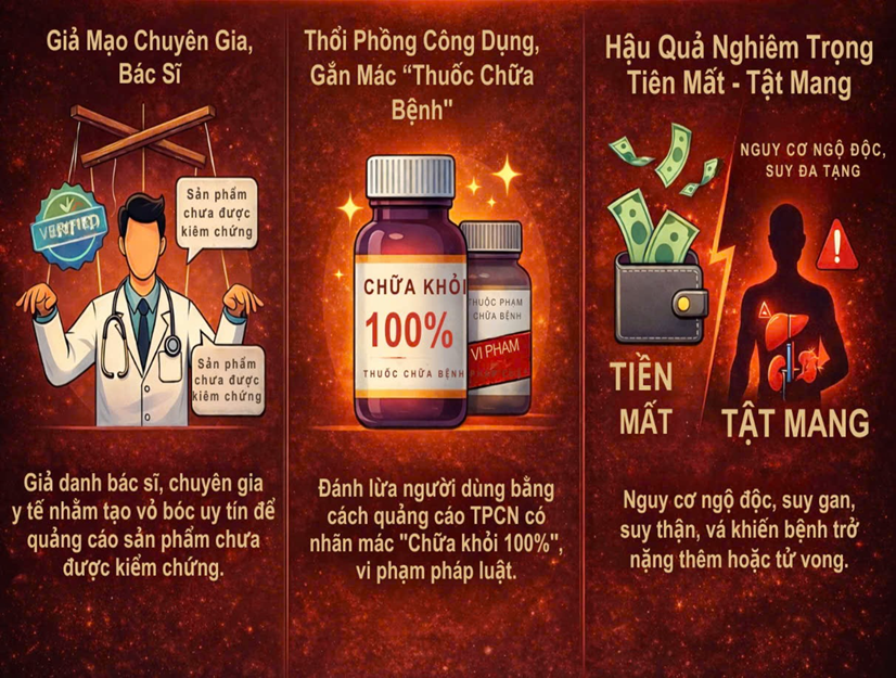 Các chiêu trò lừa đảo ngày càng tinh vi và khó nhận biết. Phổ biến là việc giả danh bác sĩ, chuyên gia y tế; sử dụng hình ảnh mặc áo blouse trắng để tạo niềm tin. Một số trường hợp còn cắt ghép hình ảnh của các bệnh viện, cơ sở y tế uy tín nhằm đánh lừa người tiêu dùng. Bên cạnh đó, việc thuê người nổi tiếng, KOLs quảng bá sản phẩm, sử dụng lời chứng thực giả, dựng lên các “câu chuyện khỏi bệnh kỳ diệu” cũng là thủ đoạn thường gặp. Nghiêm trọng hơn, nhiều quảng cáo cố tình thổi phồng công dụng, biến thực phẩm chức năng thành “thuốc chữa bệnh”, thậm chí cam kết điều trị dứt điểm các bệnh mãn tính, bệnh hiểm nghèo – đây là hành vi vi phạm nghiêm trọng quy định của pháp luật.