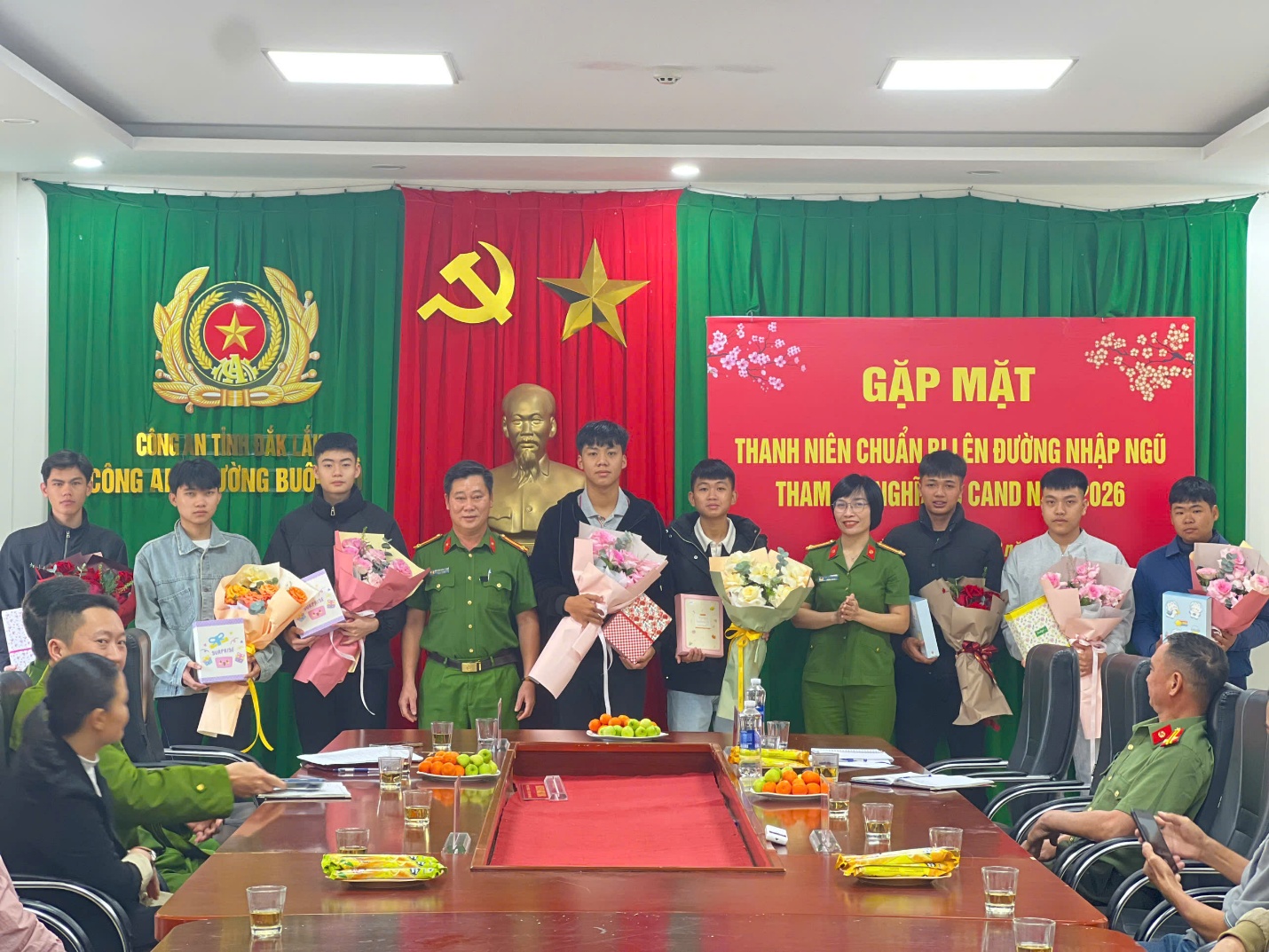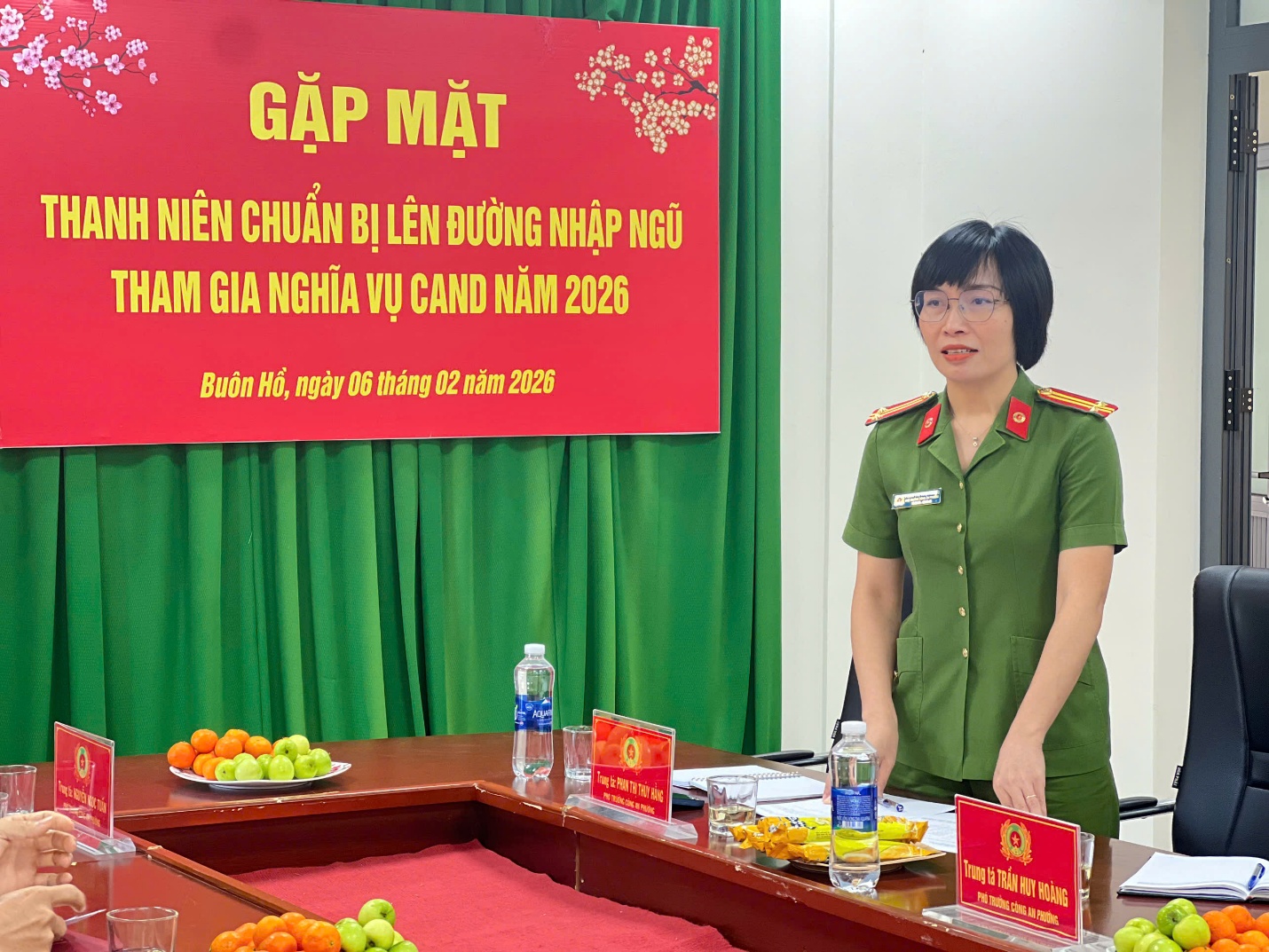 Sáng ngày 06/02/2026, tại trụ sở Công an phường Buôn Hồ, Đảng uỷ, Chỉ huy Công an phường đã tổ chức buổi gặp mặt, động viên thanh niên chuẩn bị lên đường nhập ngũ thực hiện nghĩa vụ tham gia Công an nhân dân năm 2026. Đồng chí Trung tá Phan Thị Thúy Hằng – Phó Bí thư Đảng uỷ, Phó Trưởng Công an phường chủ trì buổi gặp mặt. Tham dự có các đồng chí trong Chỉ huy Công an phường, đại diện các Tổ công tác, Đoàn Thanh niên Công an phường; các đồng chí Bí thư chi bộ, Buôn trưởng, Tổ trưởng tổ dân phố nơi có công dân trúng tuyển cư trú; đại diện gia đình cùng 08 thanh niên chuẩn bị nhập ngũ.