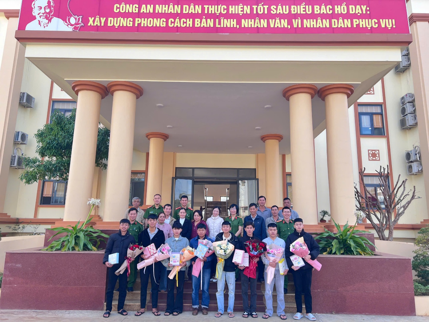 Chỉ huy Công an phường, Buôn Trưởng, Tổ trưởng TDP nơi cư trú, thân nhân gia đình chụp ảnh lưu niệm cùng các thanh niên chuẩn bị thực hiện nghĩa vụ tham gia CAND năm 2026