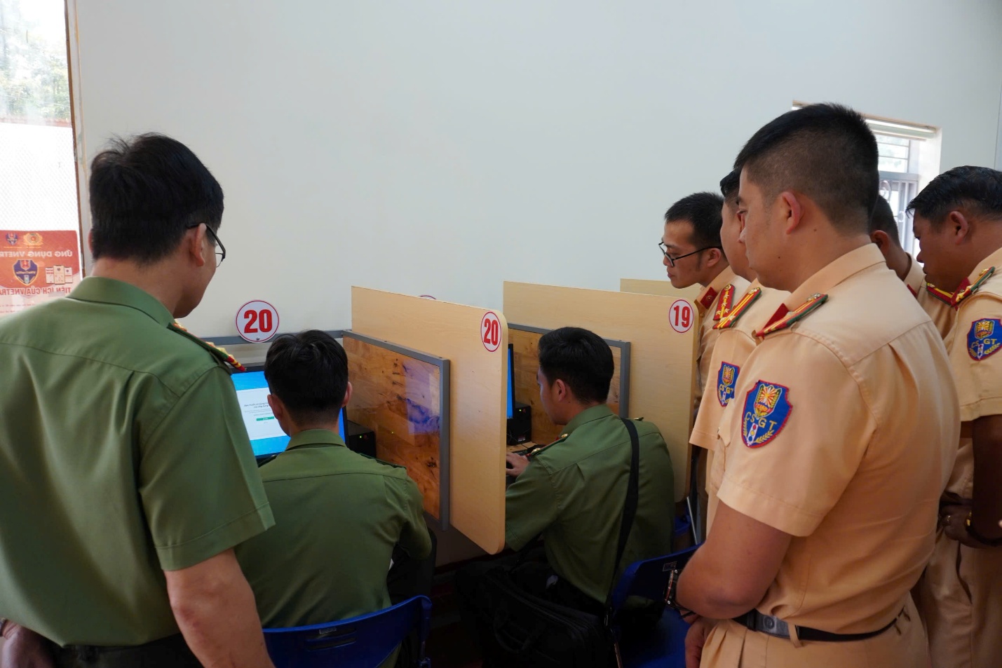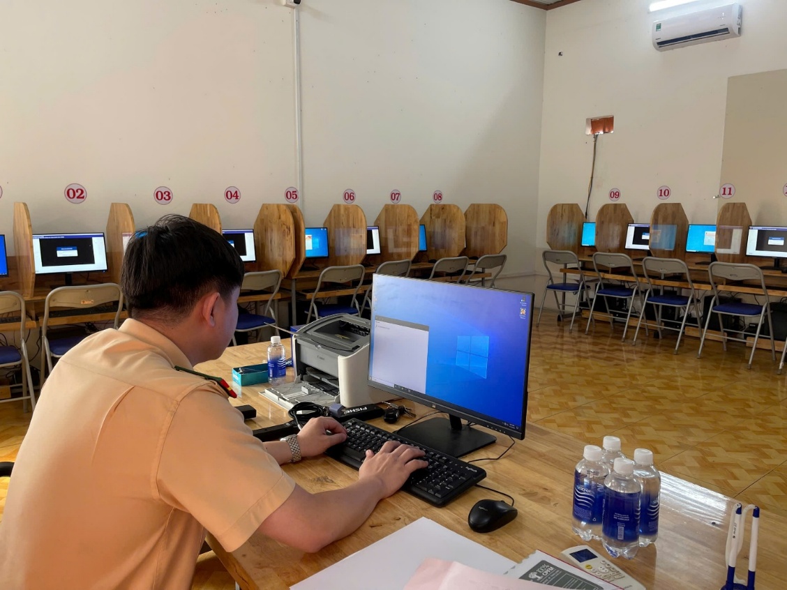 Cán bộ Đội Công nghệ thông tin, Phòng Tham mưu; cán bộ Phòng An ninh mạng và phòng chống tội phạm công nghệ cao kiểm tra an ninh, an toàn hệ thống máy phục vụ kiểm tra lý thuyết kỳ Sát hạch