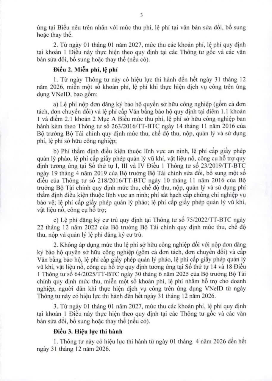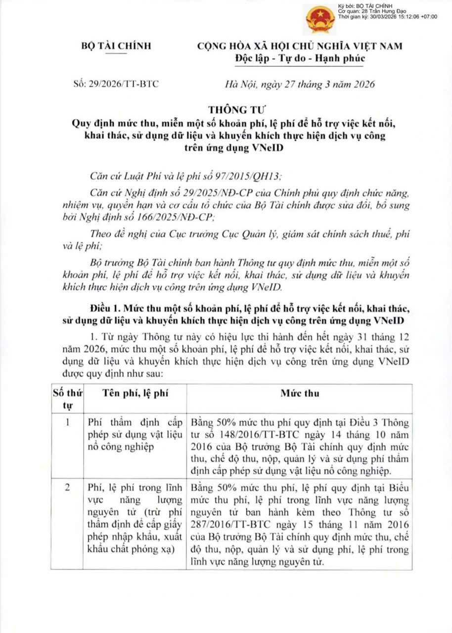 Đặc biệt, theo Thông tư số 29/2026/TT-BTC của Bộ Tài chính (có hiệu lực từ 01/4/2026 đến hết 31/12/2026), người dân khi thực hiện thủ tục hành chính trên ứng dụng VNeID được hưởng nhiều chính sách ưu đãi về phí, lệ phí. Cụ thể: