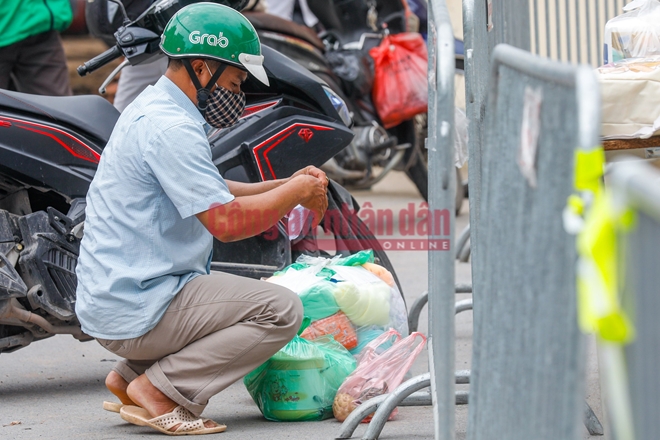 Do bị phong tỏa trong đêm nên nhiều bệnh nhân bên trong bệnh viện đã phải nhờ người thân tiếp tế đồ dùng, nhu yếu phẩm. Hình ảnh người đàn ông kiểm tra lại đồ tại chốt kiểm soát bên ngoài bệnh viện E vào sáng nay (20/8)