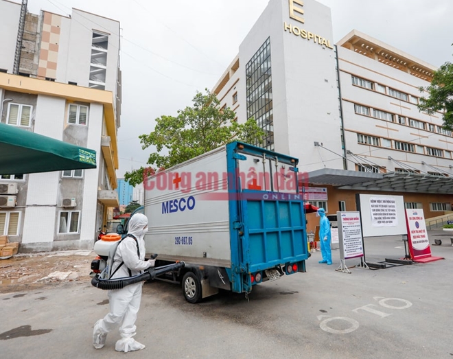 Sáng 20/8, ngày đầu tiên Bệnh viện E Hà Nội bị phong tỏa tạm thời do liên quan đến bệnh nhân dương tính COVID-19, tại các lối ra vào đều có lực lượng Công an cùng với nhân viên y tế túc trực kiểm soát toàn bộ người ra vào bệnh viện. Tất cả người và vật dụng được kiểm tra, sát trùng khử khuẩn kỹ trước khi ra vào bệnh viện.