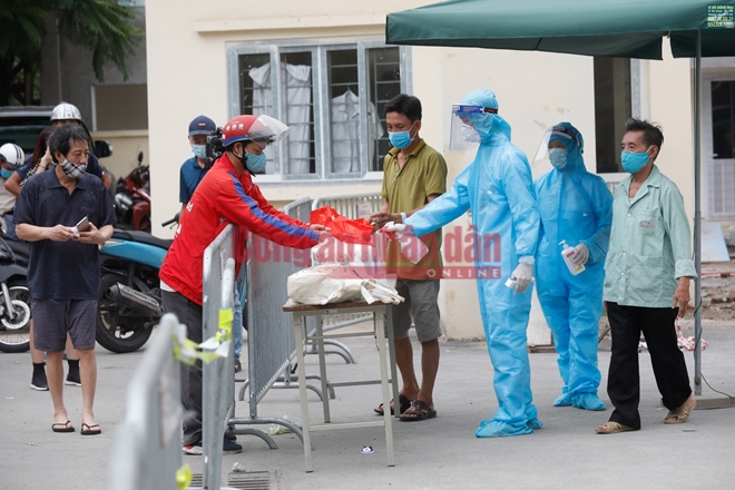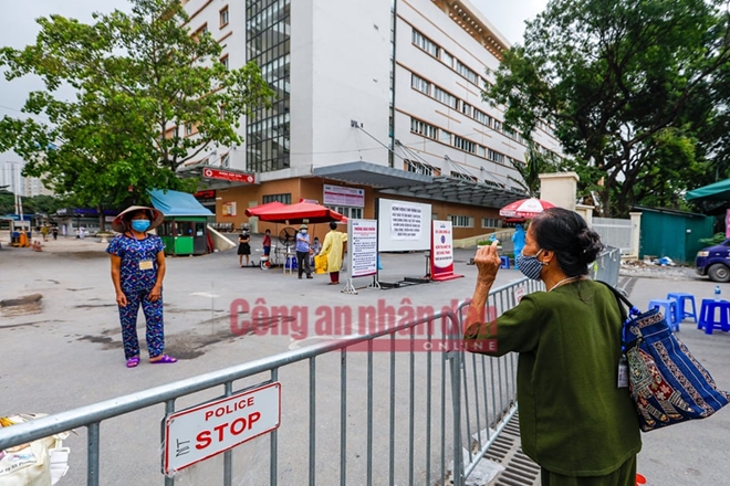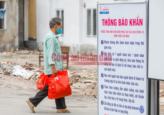 Sau khi bị phong tỏa trong đêm, tại tất cả các chốt ra vào Bệnh viện E vào sáng nay 20/8 đều kiểm soát nghiêm ngặt người ra vào. Tất cả người thân của bệnh nhân khi đến tiếp tế đồ dùng đều được yêu cầu giữ khoảng cách, đeo khẩu trang đảm bảo phòng dịch COVID-19.