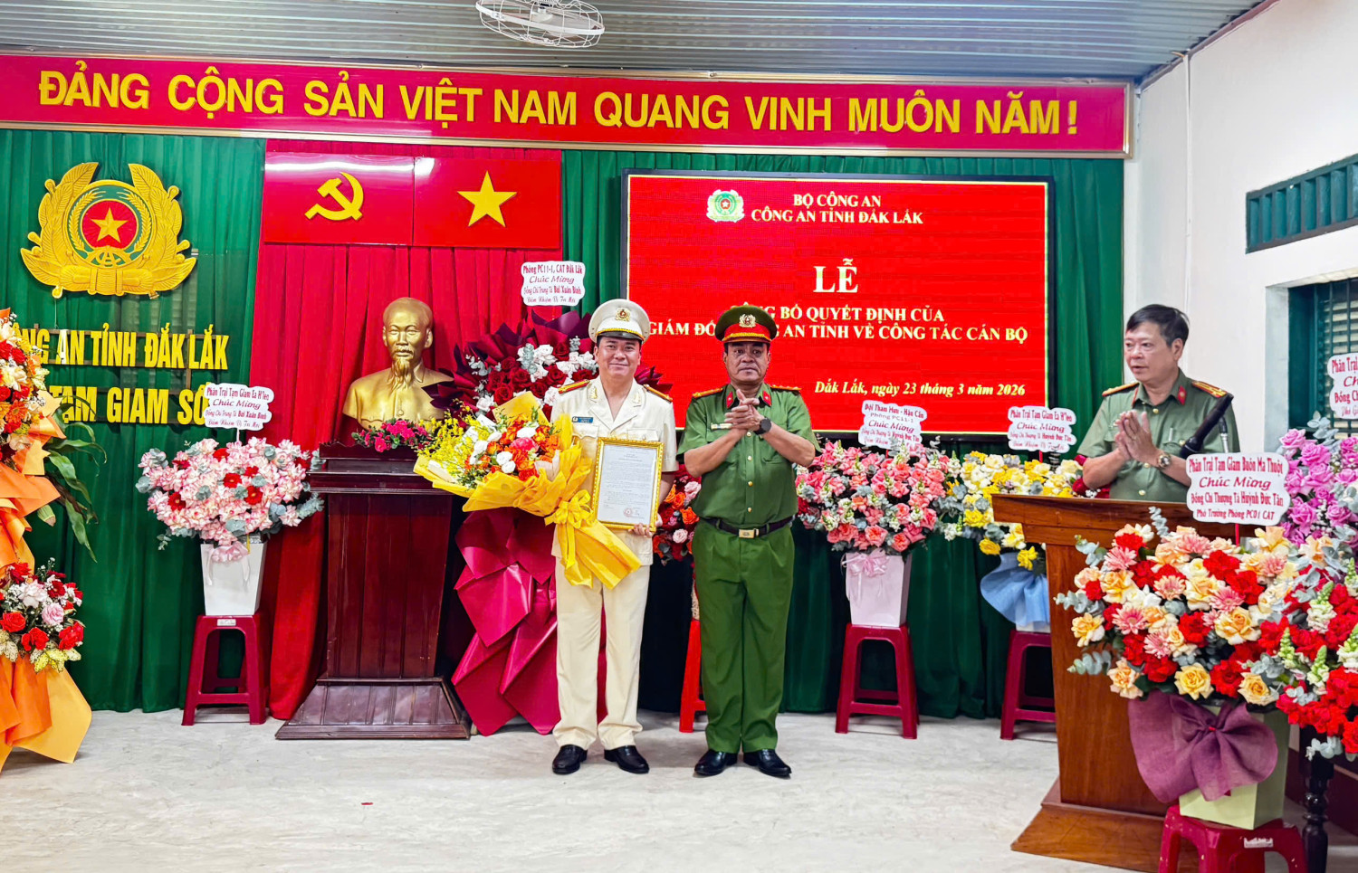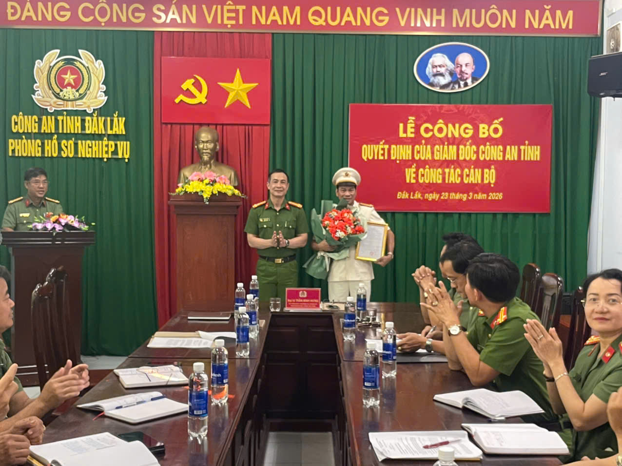 Nhằm tiếp tục kiện toàn tổ chức bộ máy, nâng cao hiệu lực, hiệu quả công tác lãnh đạo, chỉ đạo trong tình hình mới, ngày 23/3/2026, Công an tỉnh Đắk Lắk đã tổ chức công bố các quyết định của Giám đốc Công an tỉnh về công tác cán bộ tại 04 đơn vị trực thuộc. Hoạt động được triển khai đồng bộ, khẩn trương, thể hiện quyết tâm trong việc xây dựng đội ngũ lãnh đạo, chỉ huy đáp ứng yêu cầu nhiệm vụ.