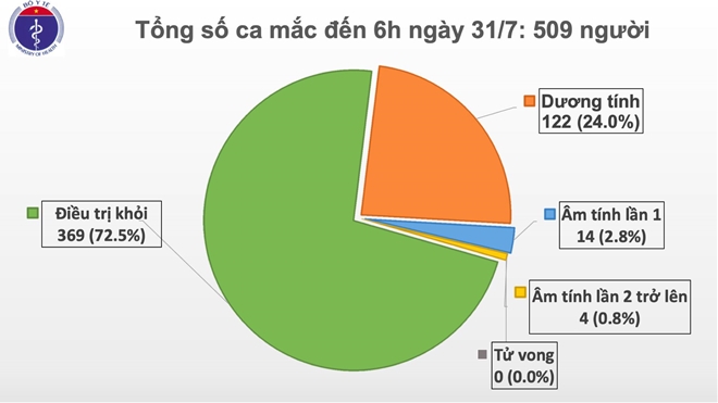 Tính đến 6h ngày 31/7, Việt Nam, có tổng cộng 509 ca mắc COVID-19, trong đó 276 ca nhiễm nhập cảnh được cách ly ngay.