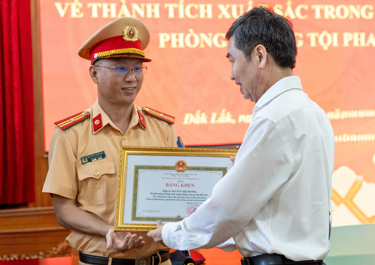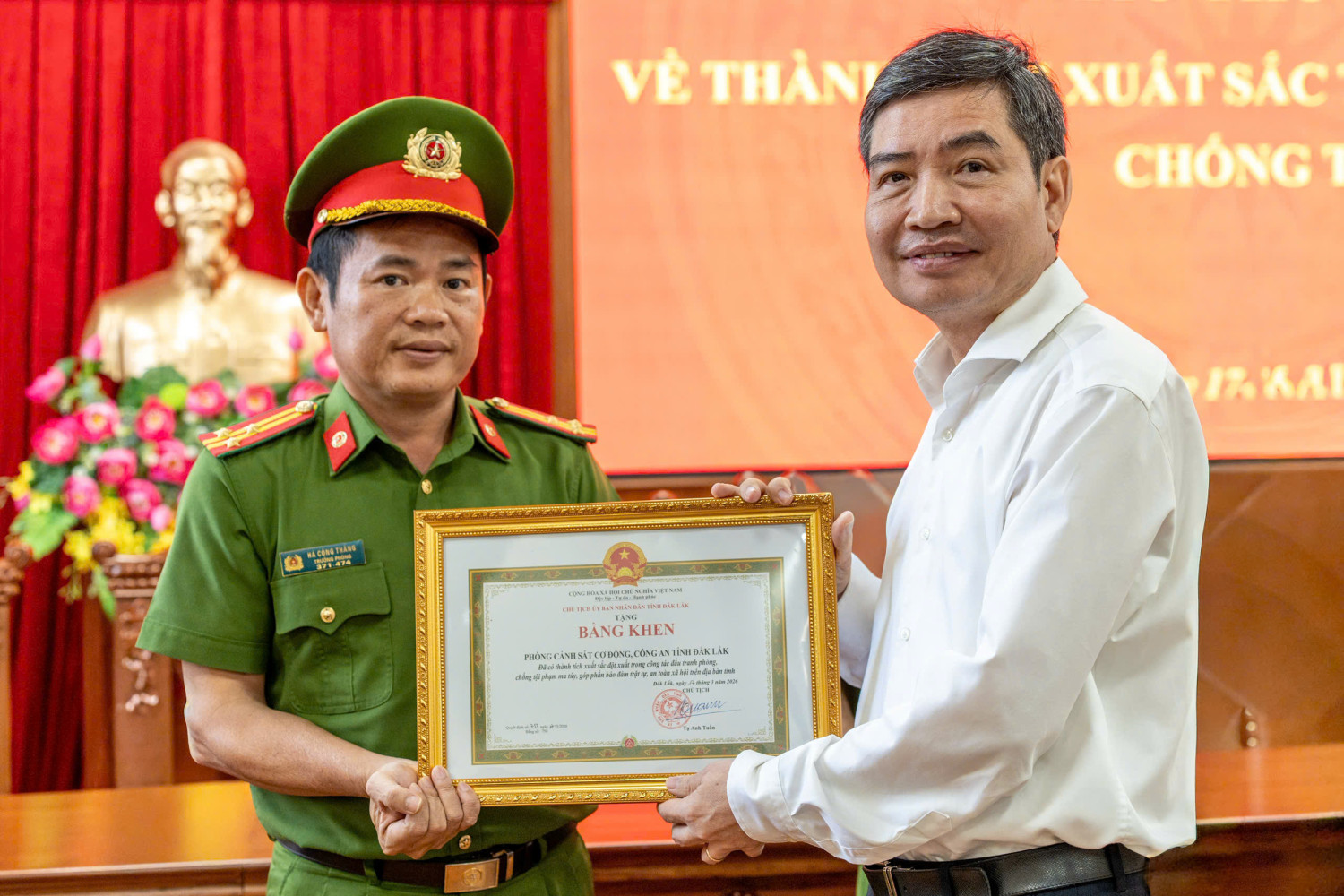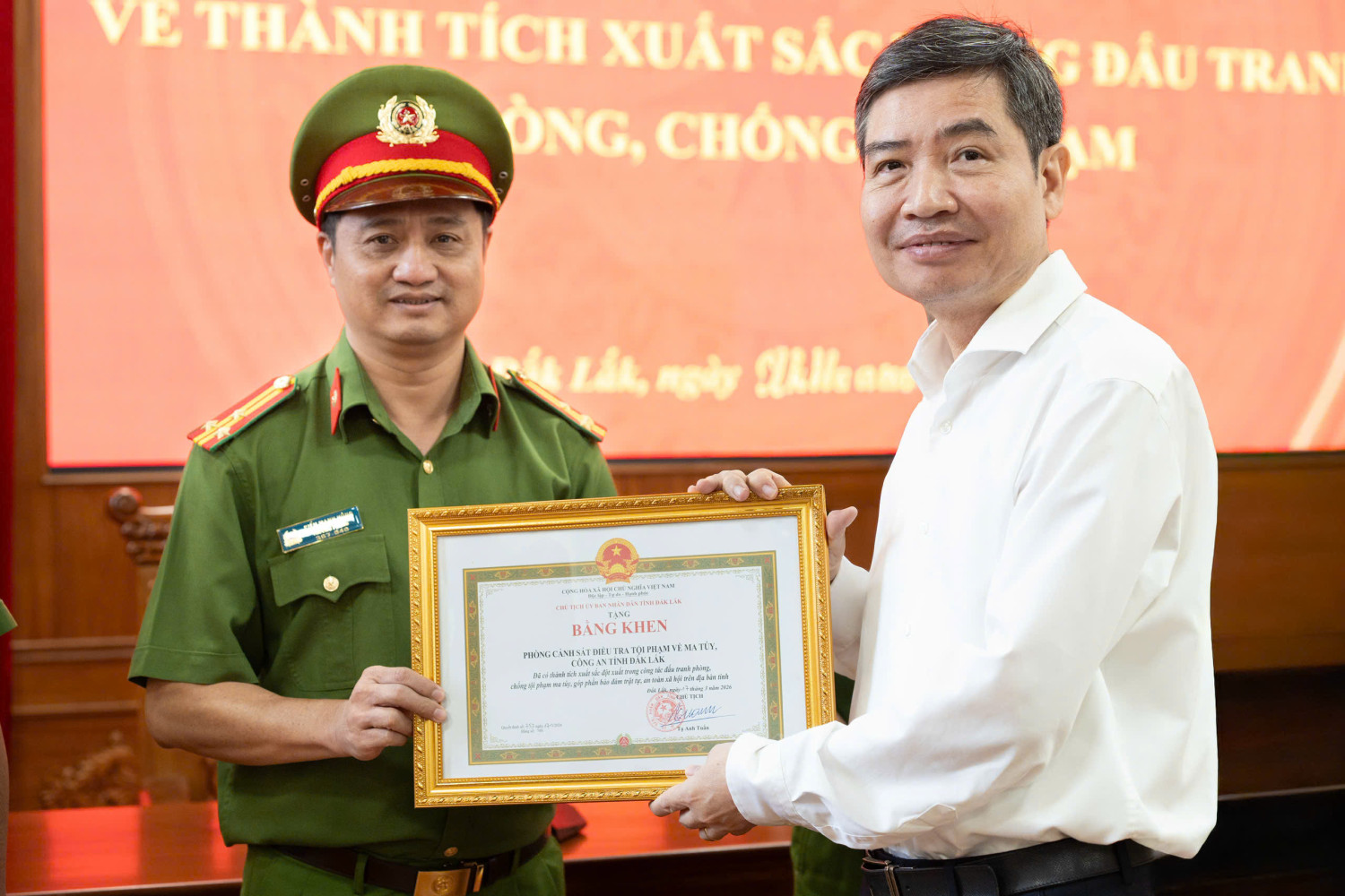 Tại buổi lễ, Chủ tịch UBND tỉnh Tạ Anh Tuấn đã gửi thư khen và trao Bằng khen cho 3 tập thể và 15 cá nhân thuộc Công an tỉnh Đắk Lắk vì đã có nhiều thành tích nổi bật trong đợt cao điểm tấn công, trấn áp tội phạm, đặc biệt là tội phạm ma túy.