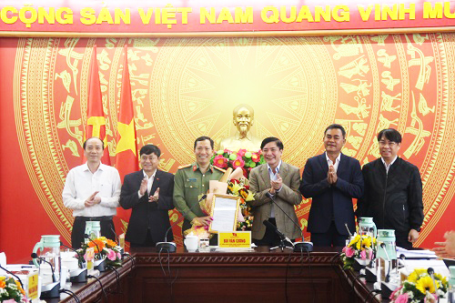 Đồng chí Bùi Văn Cường - Ủy viên Trung ương Đảng, Bí thư Tỉnh ủy trao Quyết định của Ban Bí thư và cùng tập thể Ban Thường vụ Tỉnh ủy Đắk Lắk chúc mừng Đại tá Lê Văn Tuyến