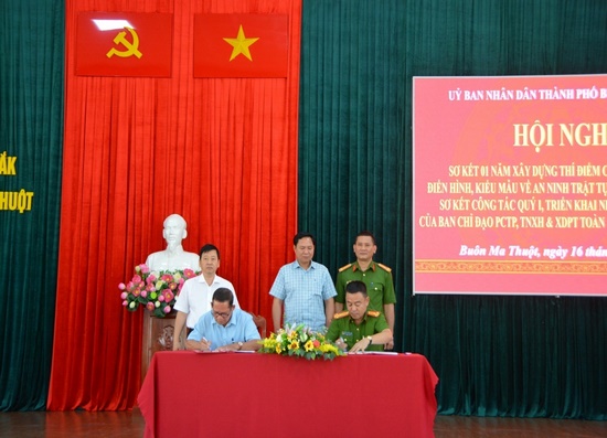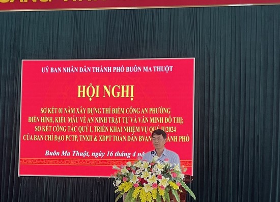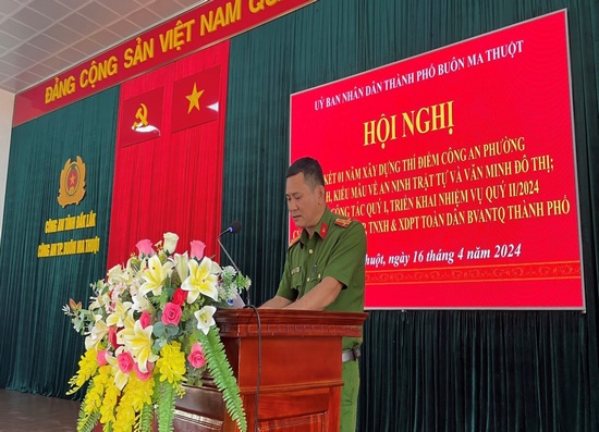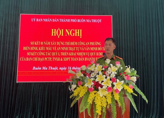 Phát biểu tại Hội nghị, đồng chí Thượng tá Nguyễn Hoành Giang – Phó Trưởng Phòng Tham mưu, Công an tỉnh, đại diện Cơ quan Thường trực Ban Chỉ đạo tỉnh đánh giá cao và ghi nhận tinh thần trách nhiệm, sự quan tâm chỉ đạo của Thành ủy, HĐND, UBND thành phố, Ban Chỉ đạo thành phố và Đảng ủy, HĐND, UBND phường Thống Nhất trong công tác phòng, chống tội phạm, tệ nạn xã hội và xây dựng phong trào toàn dân bảo vệ ANTQ nói chung và trong việc triển khai xây dựng thí điểm Công an phường Thống Nhất điển hình, kiểu mẫu về ANTT và văn minh đô thị. Trong thời gian tới, đồng chí đề nghị Ban Chỉ đạo thành phố Buôn Ma Thuột chủ động tham mưu Thành ủy, UBND thành phố ban hành các văn bản triển khai đến các phòng, ban, ngành, đoàn thể, UBND các phường, xã thực hiện công tác bảo đảm ANTT; chỉ đạo các đơn vị tăng cường phòng ngừa đấu tranh tội phạm và vi phạm pháp luật; phòng ngừa, phát hiện, đấu tranh với các loại tội phạm; xây dựng và ban hành kế hoạch xây dựng Công an phường kiểu mẫu về ANTT và văn minh đô thị để triển khai thực hiện với lộ trình cụ thể, phù hợp, hiệu quả.