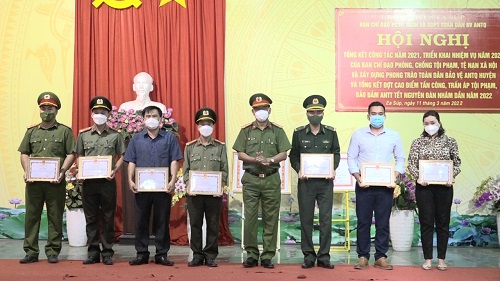 Với những kết quả, thành tích đạt được, Giám đốc Công an tỉnh đã tặng giấy khen cho 01 tập thể, 02 cá nhân; UBND huyện tặng giấy khen cho 03 tập thể 16 cá nhân đã có thành tích trong đợt cao điểm tấn công trấn áp tội phạm, đảm bảo ANTT Tết Nguyên đán Nhâm Dần 2022. UBND huyện tặng giấy khen cho 08 tập thể, 09 cá nhân đã có thành tích trong công tác PCTP, PCMT, phòng chống mua bán người và XDPT toàn dân bảo vệ ANTQ năm 2021./.