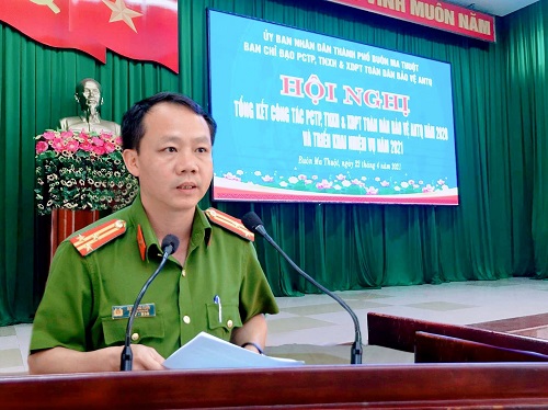 Đồng chí Thượng tá Bùi Trọng Tuấn – Trưởng Công an thành phố, Phó Trưởng Ban Thường trực Ban chỉ đạo PCTP, TNXH và XDPT toàn dân bảo vệ ANTQ thành phố Buôn Ma Thuột phát biểu tại Hội nghị