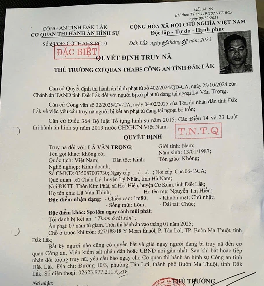 Theo hồ sơ vụ án: Vào năm 2014, Trọng ký hợp đồng lao động với Công ty Cổ phần Tổng Công ty Nông nghiệp Quảng Bình, đảm nhiệm công việc cán bộ kinh doanh tại Chi nhánh Tây Nguyên. Khoảng thời gian từ năm 2017 đến 2018, Trọng thu tiền từ các khách hàng của Công ty nhưng không nộp lại theo quy định mà chiếm đoạt số tiền gần 700 triệu đồng. Với hành vi phạm tội trên, Lã Văn Trọng bị Tòa án nhân dân cấp cao tại Đà Nẵng xử phạt 07 năm tù giam về tội “Tham ô tài sản” theo quy định tại khoản 3, theo Điều 353 Bộ luật Hình sự năm 2015 (sửa đổi, bổ sung năm 2017). Nhưng trong thời gian được tại ngoại, đối tượng đã bỏ trốn khỏi địa phương nhằm trốn tránh thi hành án. Ngày 03/3/2025, Cơ quan Thi hành án hình sự Công an tỉnh Đắk Lắk đã bị ra quyết định truy nã đặc biệt nguy hiểm theo Quyết định truy nã số 03/QĐ-CQTHAHS-PC10.