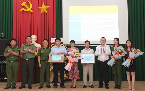 Ông Chu Văn Việt (thứ ba từ phải qua) tặng máy móc, phương tiện cho Tổ công tác và Tổ giúp việc mô hình “Ứng dụng công nghệ thông tin thực hiện Đề án 06 phục vụ chuyển đổi số, nâng cao hiệu quả cải cách hành chính trên địa bàn phường Tân An”