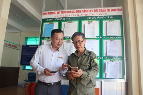 Ông Chu Văn Việt (bên trái) hướng dẫn người dân truy cập ứng dụng Zalo để theo dõi và cung cấp thông tin về an ninh trật tự