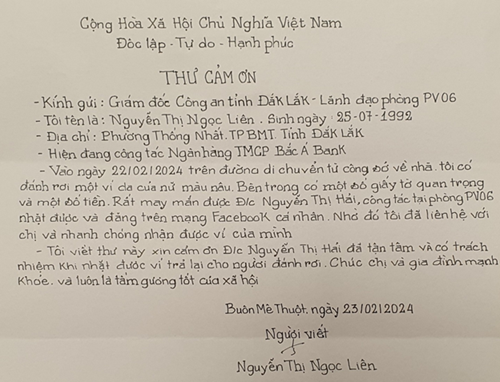 Thư cảm ơn của chị Ngọc Liên sau khi nhận lại được tài sản bị đánh rơi